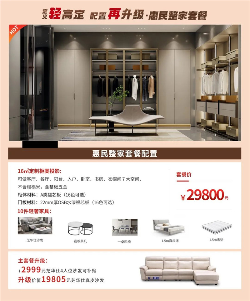 而“配置再升級”這一點,客來福家居也落實在套餐中。在針對不同需求的家庭制定「全屋整家套餐」及「惠民整家套餐」時,客來福還分別對套餐進行配置升級的選項。