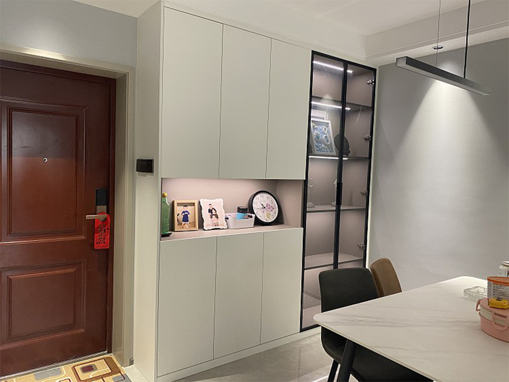 進門是餐廳,所以設(shè)計師將入戶玄關(guān)柜和酒柜合二為一,多功能的柜子采用一柜到頂?shù)臉邮?,實木乳白玄關(guān)柜可以在落地柜存放鞋子和雜物,在上層的柜子里還可以收納餐具,作為餐邊柜。中間鏤空的柜面可以擺放相冊等裝飾品,或者擺放日常用品。