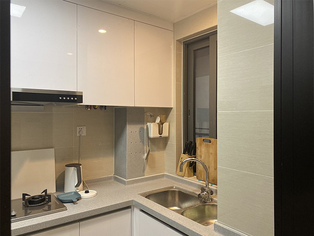 C字型廚房占整個房屋面積很小,但是五臟俱全。上下柜體都可以收納,大理石臺面方便清理。