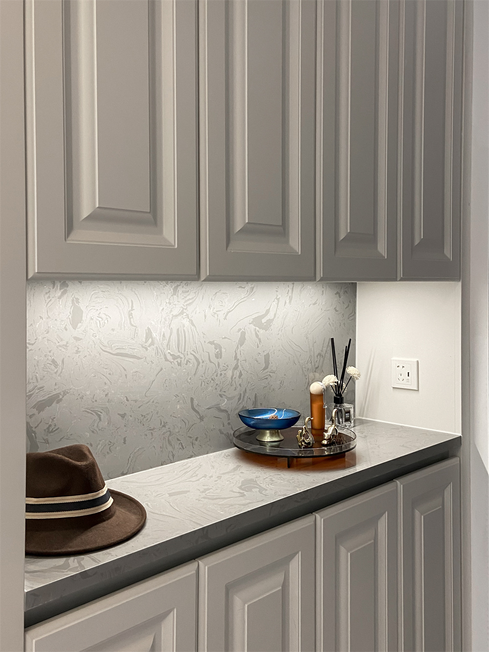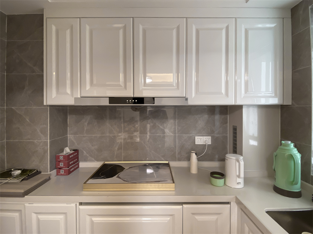 廚房是L型的櫥柜布局,切菜區(qū)、臺盆區(qū)、烹飪區(qū)形成一條動線,讓烹飪不再手忙腳亂。芬蘭白膜壓櫥柜門板,如奶油般的質(zhì)感更加細(xì)膩自然。吊柜應(yīng)當(dāng)與臺面保持距離,避免因為距離過近影響使用效果。