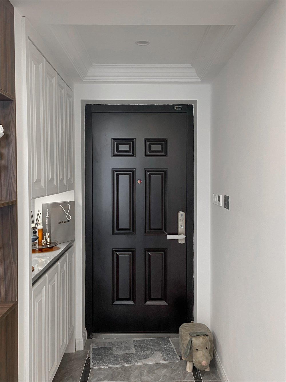 定制的整面到頂?shù)男P(guān)柜,芬蘭白的顏色頗為典雅,中部的空余部分可以放置鑰匙包等生活物品,在到頂鞋柜的底部同樣留出一排空間,放一些常換的拖鞋,掃地機器人也能進去清掃,衛(wèi)生無死角。玄關(guān)的柜子都做了無拉手設(shè)計,相對比較整潔。擺放一些精致的小飾物,體現(xiàn)出屋主優(yōu)雅的品味。