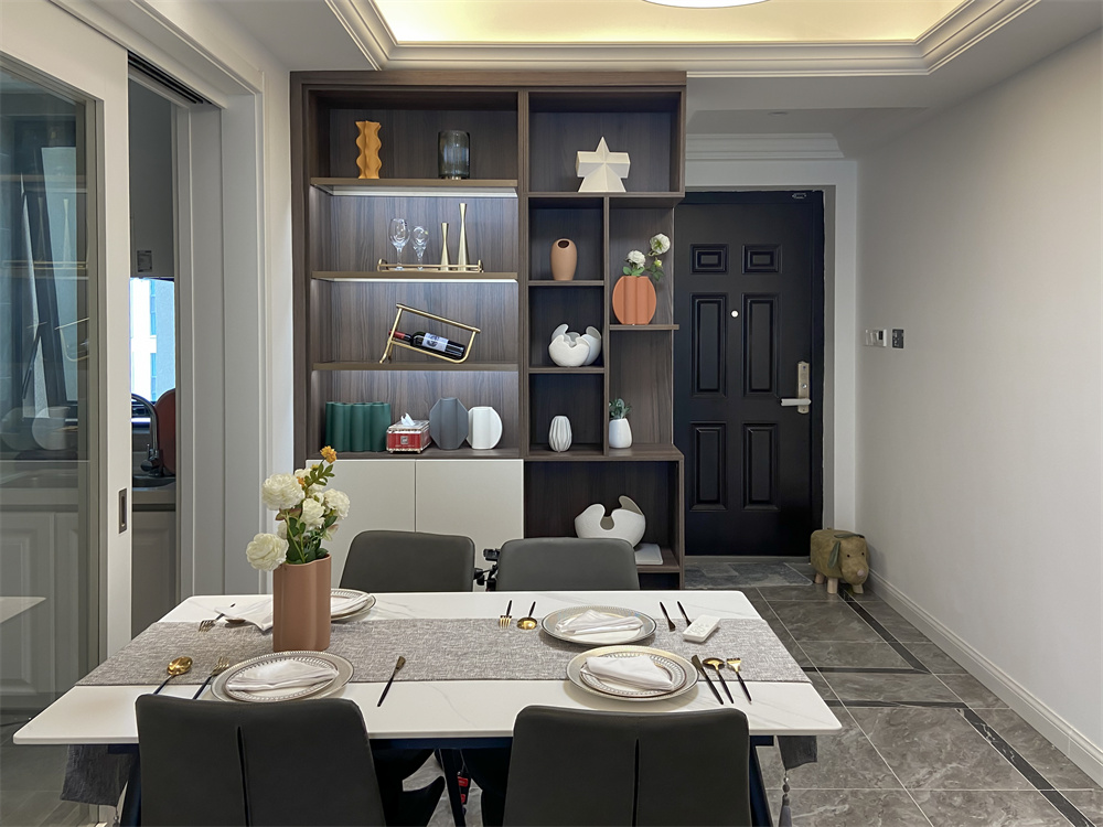 整排的餐邊柜收納柜,讓功能性大大加強,平常的餐具、藏酒都可以妥妥的安排下,開放的柜子作為展示,也可以放置一些??吹臅脱b飾擺件。餐桌上擺放花束讓吃飯多了一絲溫馨,餐邊柜的不規(guī)則設(shè)計柜層,不僅滿足不同高度物品收納的需要,使整體更加具有層次感。