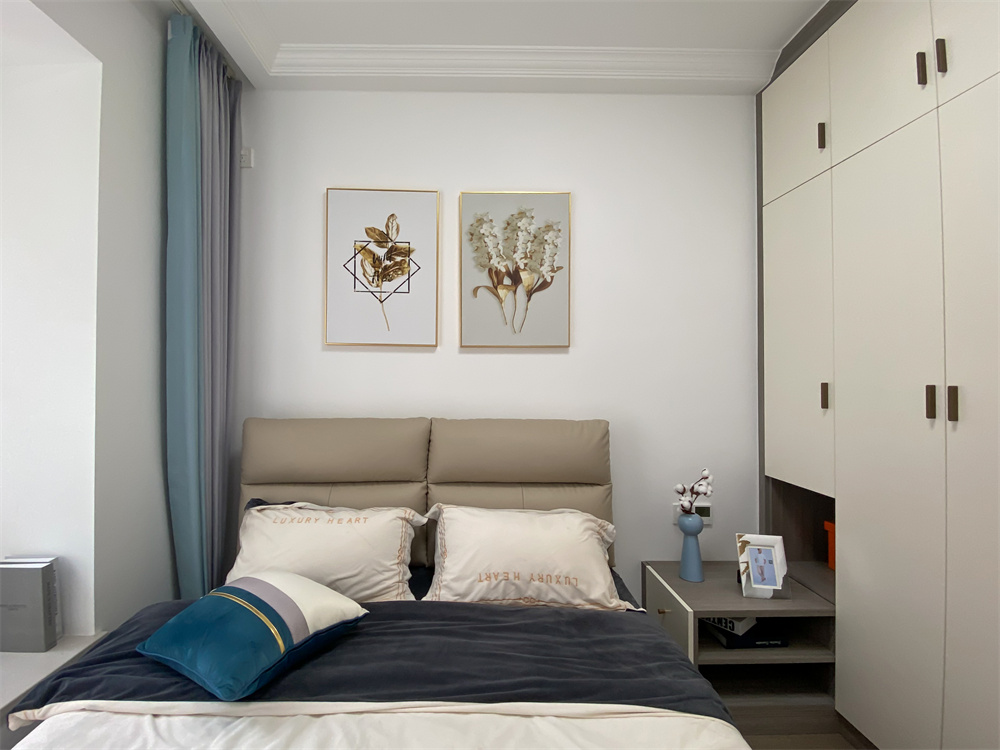 白色床單和灰色床頭的顏色搭配,整體更加輕松簡潔。芬蘭白整面衣柜為衣物收納提供好住處,側(cè)面板可以打開內(nèi)置長方形小鏡子,梳妝完成后可以通過鏡子看一看今天的氣色,感受不一般的心情。