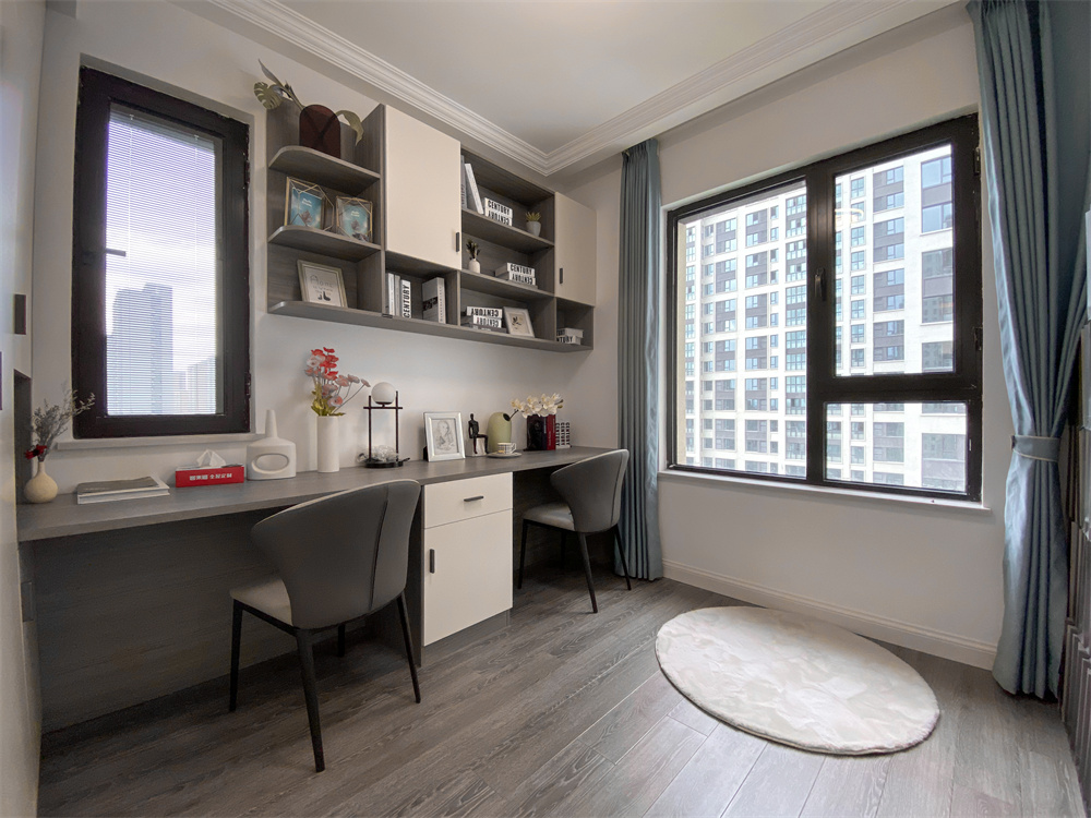 先是整面的柜子,然后與柜體相連接的書桌。吊柜采用灰橡木紋加芬蘭白的顏色搭配,從板材中透露出時光的內(nèi)涵。書桌的長度兩個人一起辦公、聽音樂、品茶都是不錯的選擇,在工作之余放松自己也不失為一種享受。