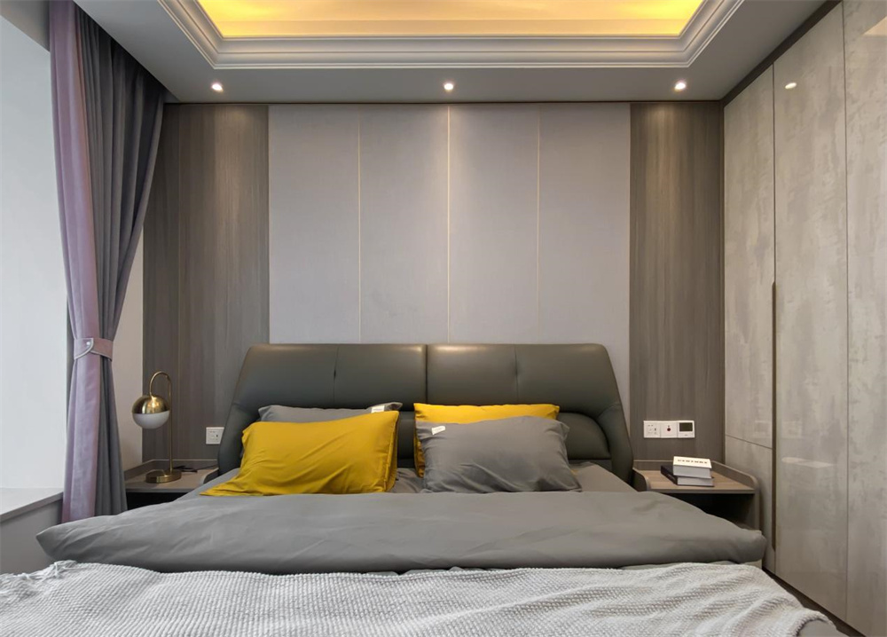 主臥整體延續(xù)輕奢的風(fēng)格,以黑白灰襯底。背景板用的是灰白兩色護墻板,呈現(xiàn)簡約干練的特質(zhì)。墻面未著任何的點綴,卻也不顯得空曠突兀。以灰色為主調(diào)的舒適床品,加以穿插其間的黃色調(diào),在床頭射燈的氛圍烘托下,時尚又不失溫馨感。