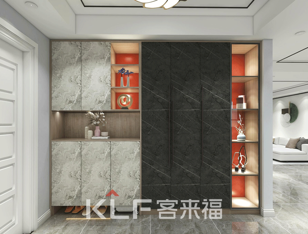 入戶柜以大方簡潔為基調(diào),黑白紋理門板帶來沉穩(wěn)平和,鏤空結(jié)合實門設(shè)計,在取舍之間,尋找微妙的平衡。背板荔枝紅跳色更有視覺沖擊感。