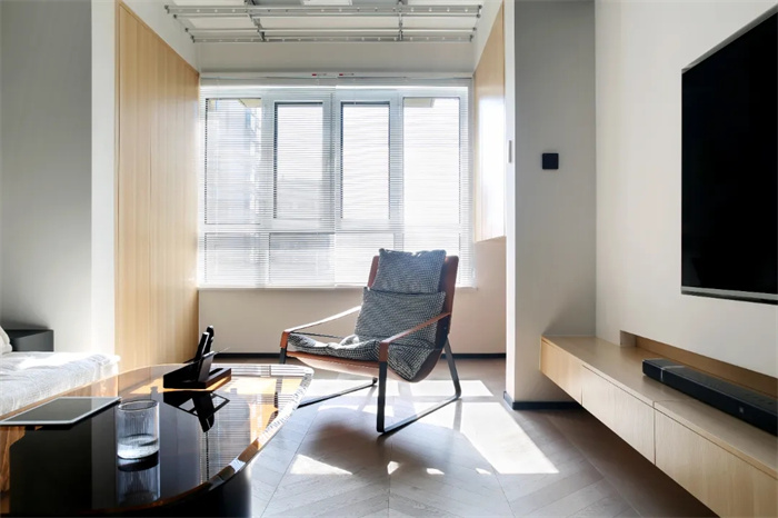 以白、灰、原木為主要色系,搭配千鳥格紋和愛馬仕橙,賦予整個空間復(fù)古簡約的濃郁氣息,從客廳透過的陽光,透過百葉窗劃分為細碎的觀影投射在木地板上,格外閃亮。