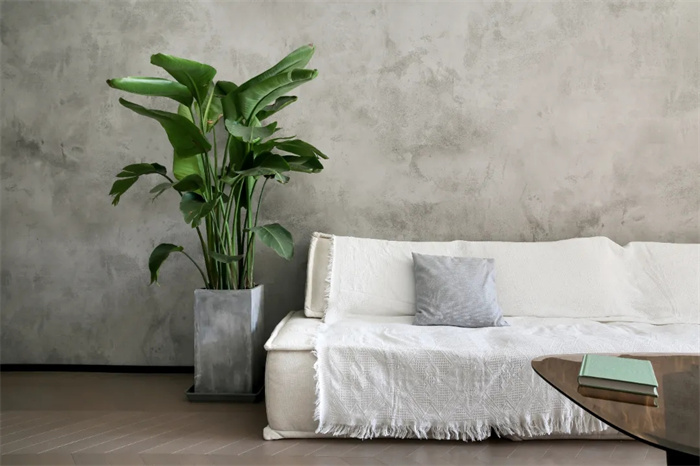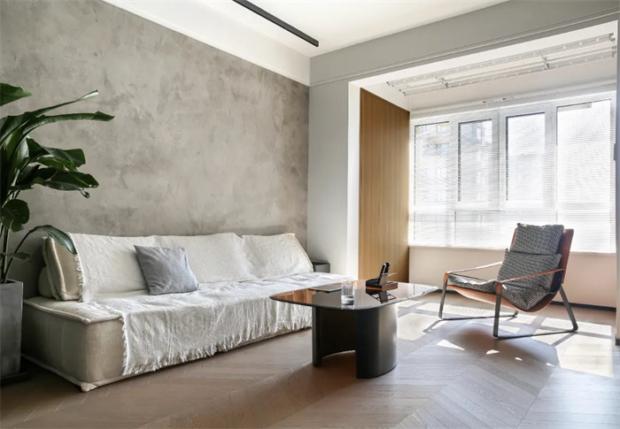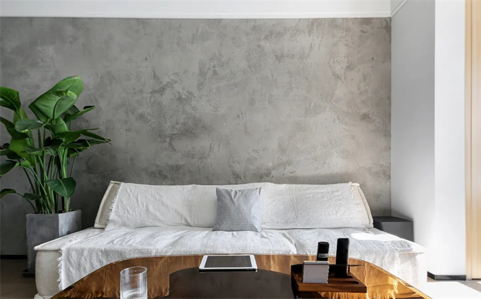 類似于侘寂風(fēng)的水泥風(fēng)格背景墻,斑駁的灰色紋路給人穩(wěn)定情緒的作用,背景墻采用的是仿真水泥墻面的墻布,比較實用且可以降低裝修成本,觸感柔軟。沙發(fā)上蓋了一條白色流蘇沙發(fā)布,以卡其色沙發(fā)套打底,整體顯得十分柔和。魚骨紋的拼接地板承襲了空間一貫的簡約風(fēng)格,偌大的立體綠植給增添一抹生機。