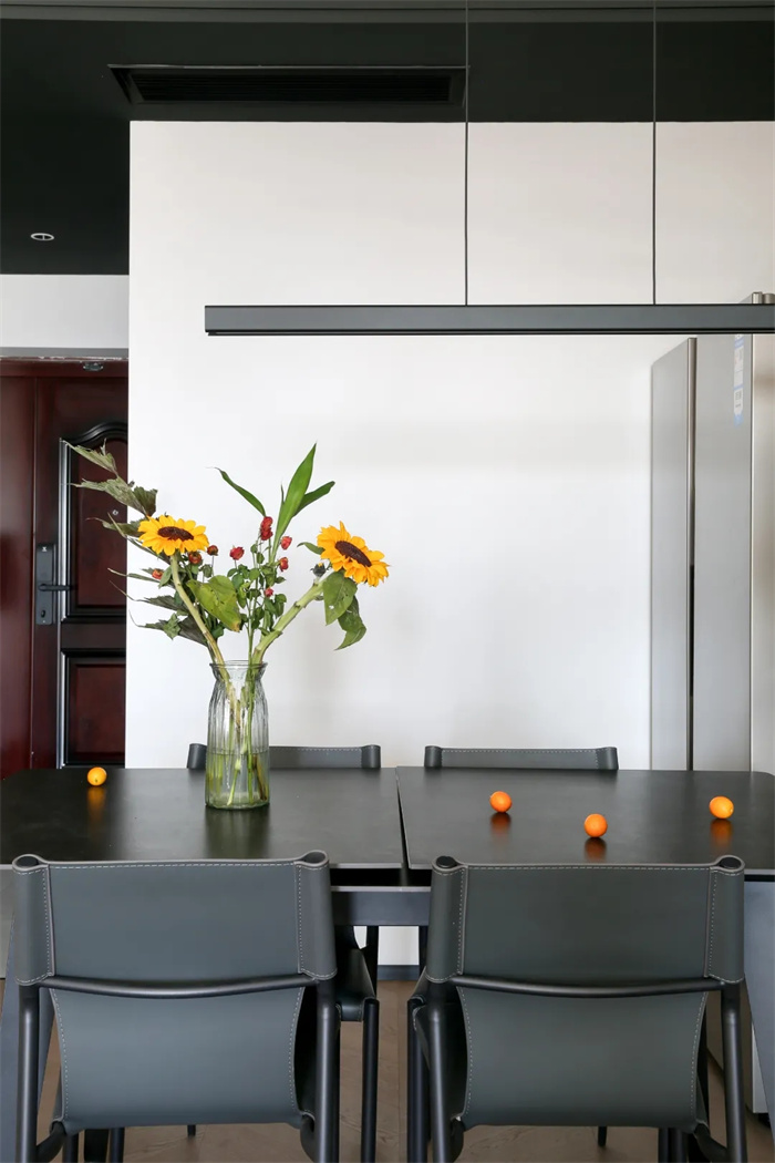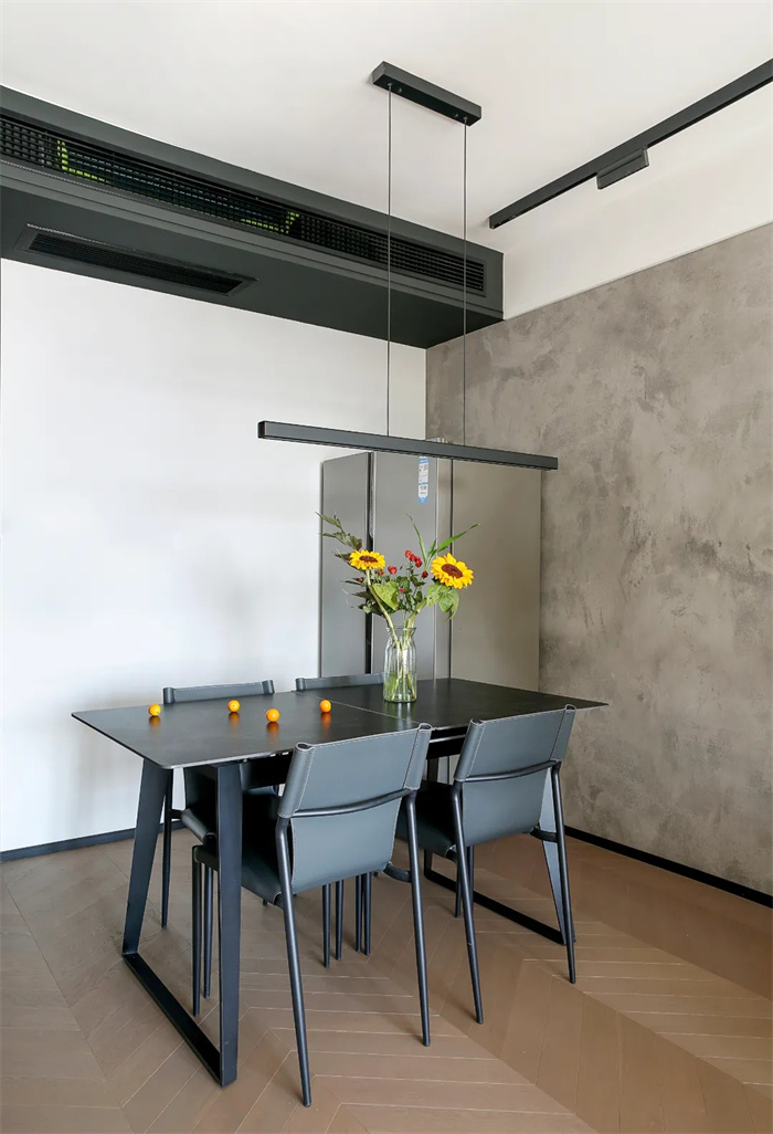 水泥灰的餐桌透露出滿滿的工業(yè)風(fēng)設(shè)計,桌上擺放新鮮的花束,業(yè)主時不時會購買新鮮的花束擺放在餐桌上,展現(xiàn)出對美好生活的精準向往。