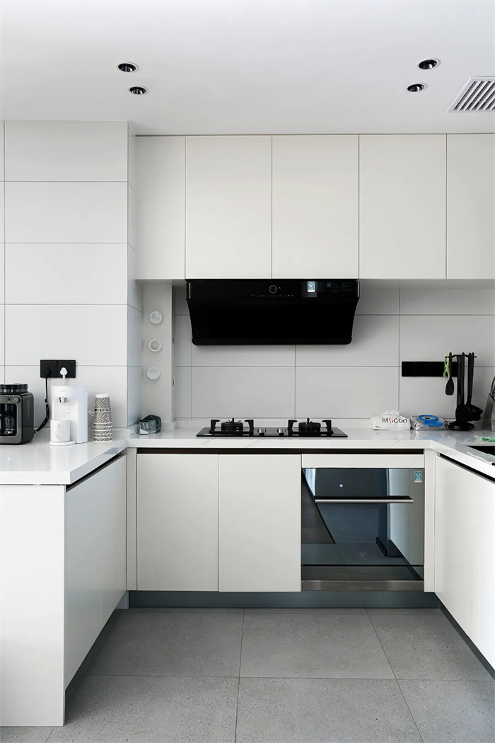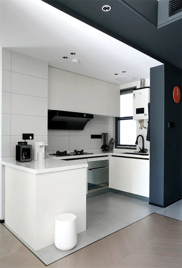廚房在進門的右側(cè)打造出了U字型的空間布局,類似于公寓性質(zhì)的開放性廚房,在玄關(guān)延伸出一部分墻體,在廚房格局的左側(cè)延伸一部分可以作為島臺使用,形成完整的廚房空間。