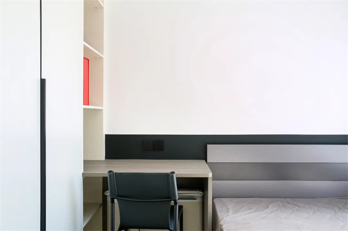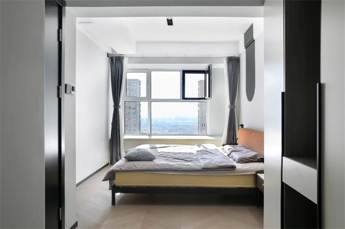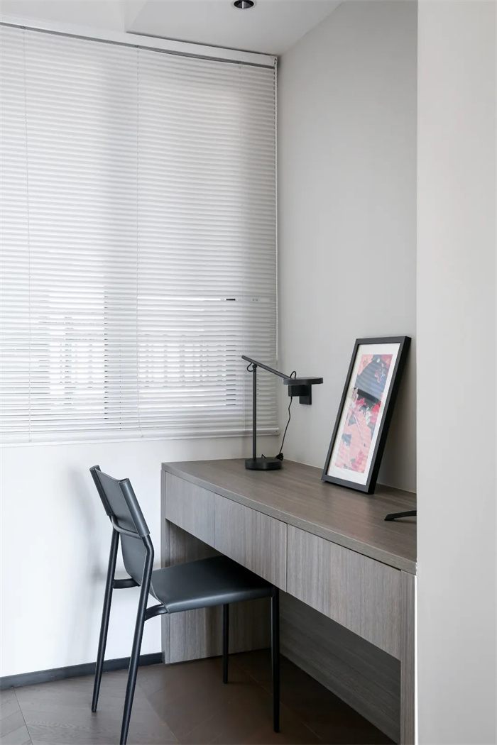 次臥同樣是采用整面到頂?shù)囊鹿?,搭配黑色的長條把手,靠墻的一側(cè)打造成開放收納格的設(shè)計,延伸的桌面下方放了暖風(fēng)機等設(shè)備,次臥格局雖不大,勝在簡約。