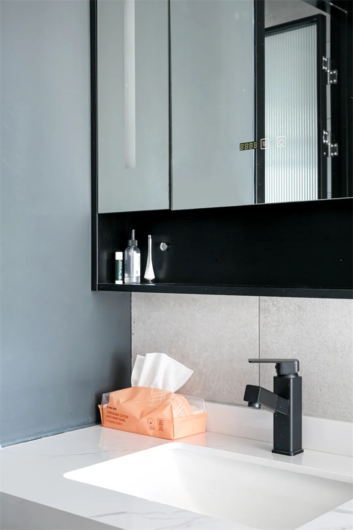 玄關(guān)處的柜體采用兩開門的樣式,中間部分內(nèi)置燈帶鑰匙、快遞、裝飾物便于查找。下方留出空間用于放置日常在家穿的拖鞋。