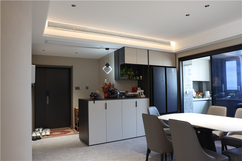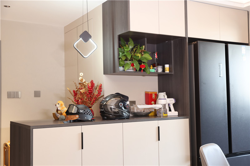 入戶柜L型設(shè)計(jì),選用客來??萍寄炯y+茶白,百搭自然;柜體設(shè)計(jì)充分利用入戶空間,一邊打一柜到頂式整面墻衣柜,增加收納能力,另一邊中部留空放置裝飾品或日常常用物品,既有顏值又實(shí)用;保證收納同時(shí)還內(nèi)嵌冰箱,為廚房減輕儲物壓力。
