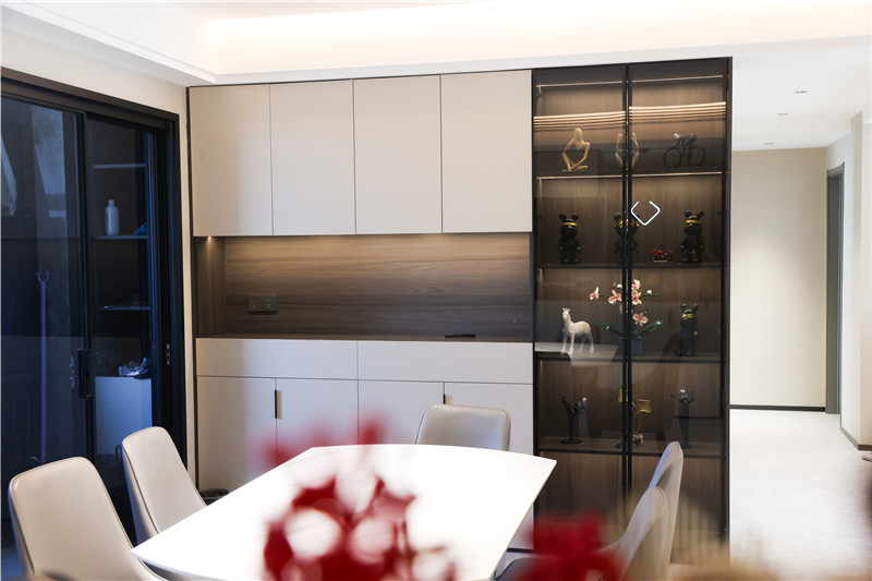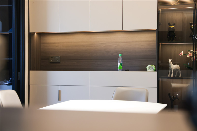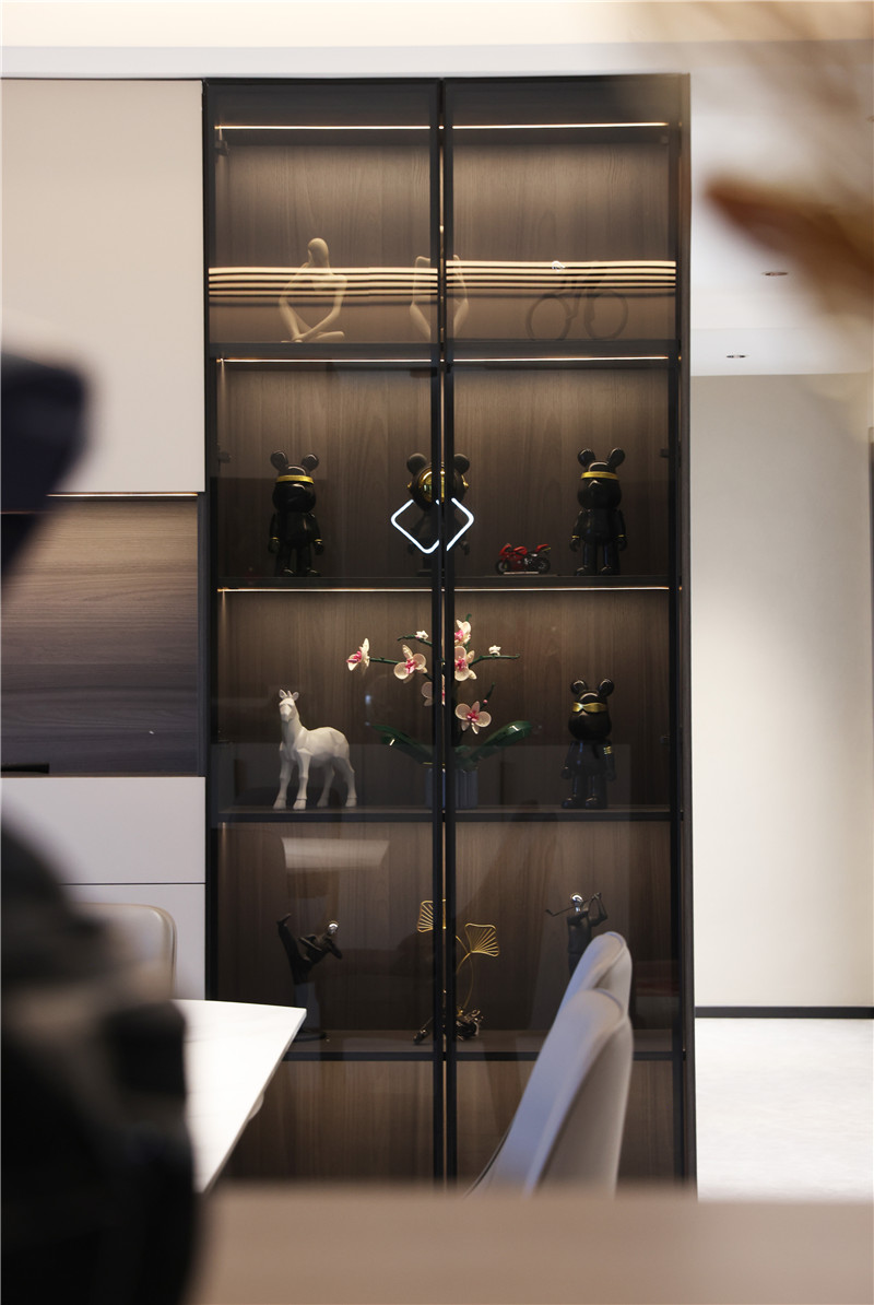 現(xiàn)代輕奢少不了細(xì)節(jié)的精致,玻璃柜內(nèi)部木質(zhì)紋理與內(nèi)置燈帶,形成自然與現(xiàn)代的碰撞;黑玻比透明玻璃更加高級時(shí)尚,也是裝修時(shí)可以留意的設(shè)計(jì)點(diǎn)~