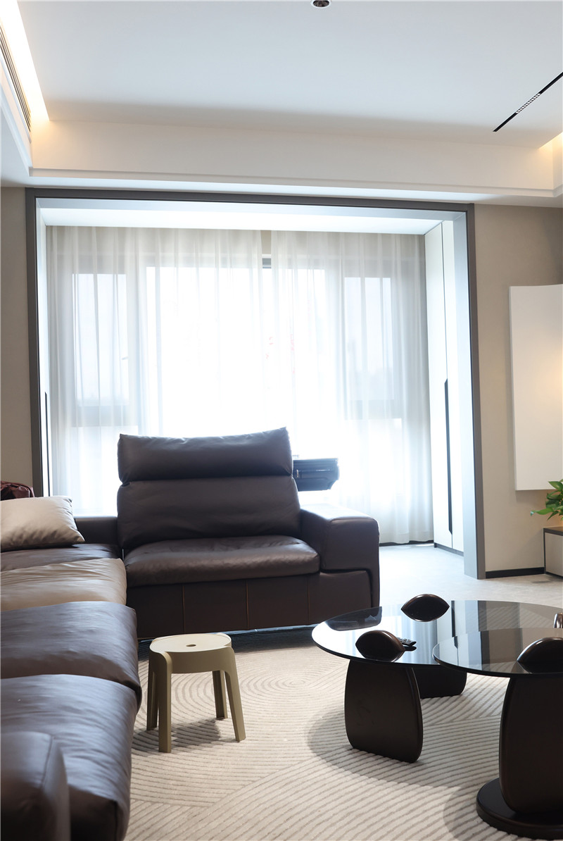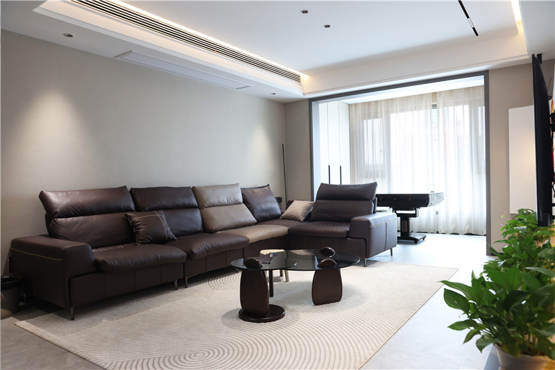 來到客廳,迎面而來是中性色調(diào)散發(fā)出的高級氛圍,黑色亮面沙發(fā)、白色曲線地毯、黑色小茶幾……整體表達(dá)出屋主時(shí)尚、個(gè)性的家居品味。