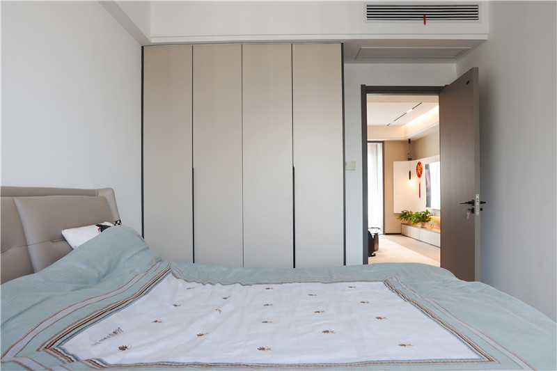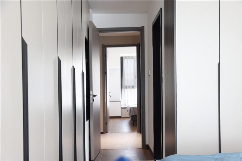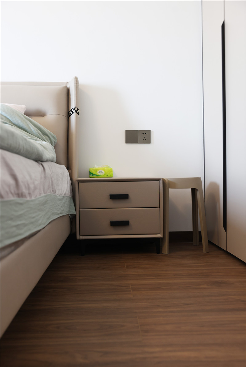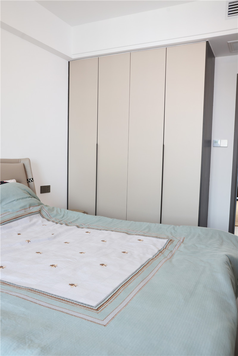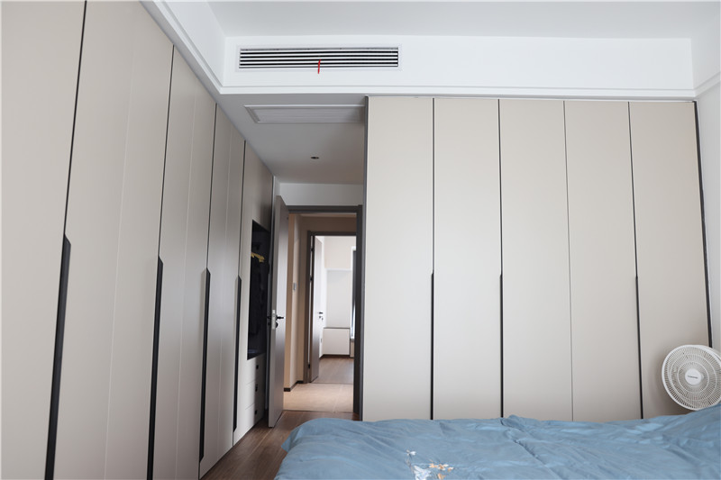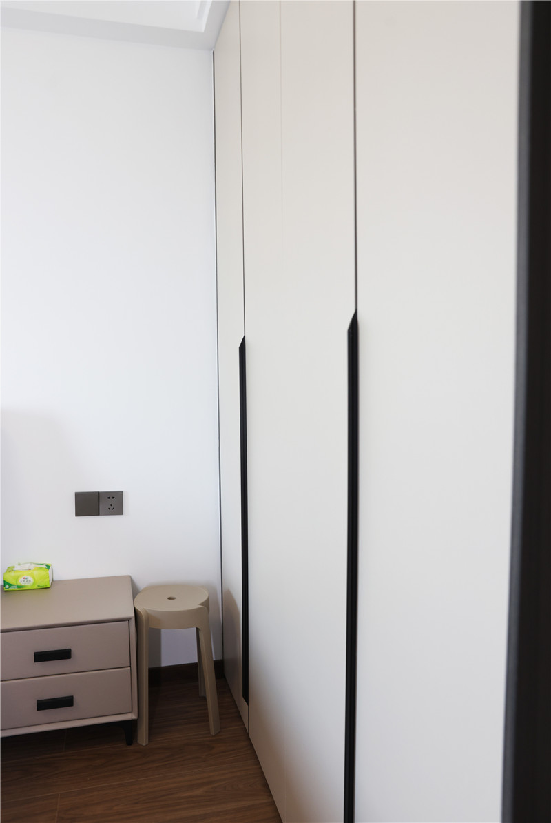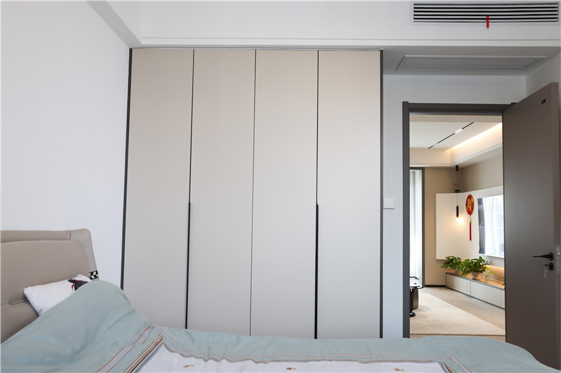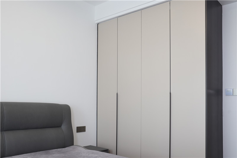 主臥與次臥根據(jù)不同人需求與生活習(xí)慣,都選用了客來??萍寄炯y+茶白,打造不同造型的柜體。衣柜擁有強(qiáng)大收納能力同時(shí),不影響空間顏值與人的活動范圍。