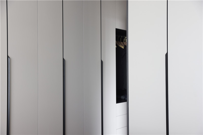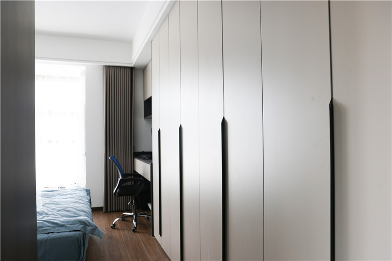 靠墻打一整面一柜到頂式衣柜,將其用作衣帽間+書桌,預(yù)留開放掛衣區(qū),滿足日常使用習(xí)慣;選用一字型長條拉手,視覺上簡潔、時(shí)尚。