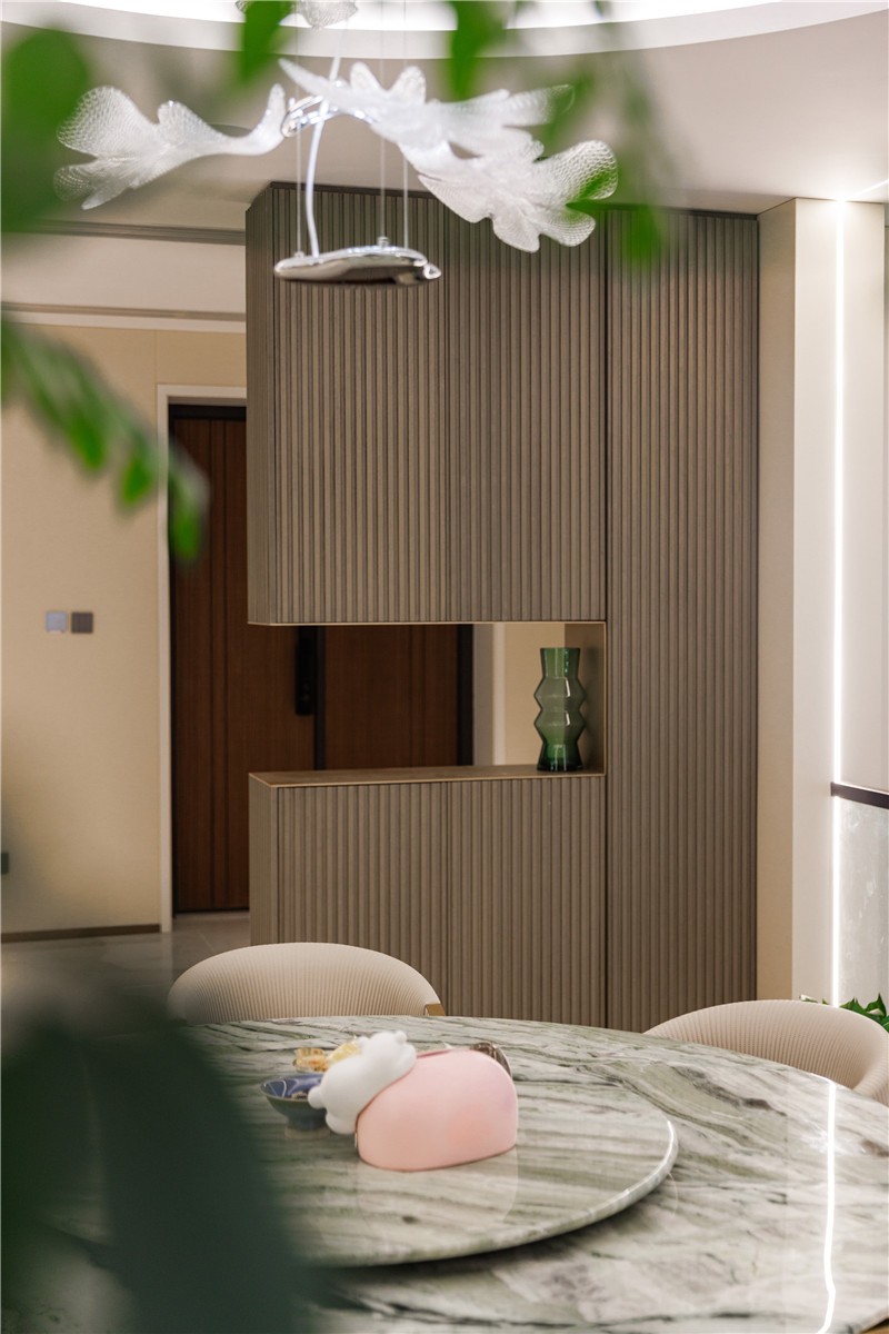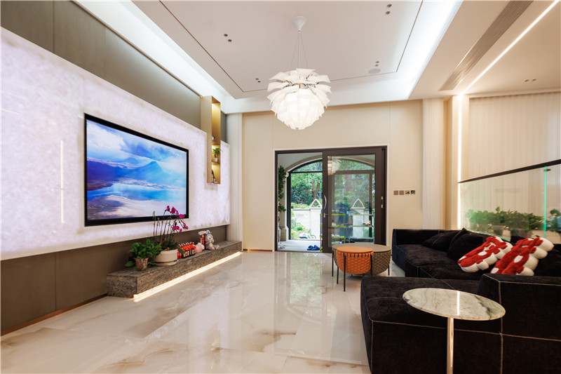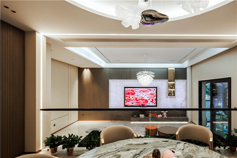仿石材電視背景墻暗藏的燈光漸亮,整個屋子的氛圍便圍繞華貴與精致展開,不規(guī)則的開放格設(shè)計頗有現(xiàn)代感意味。