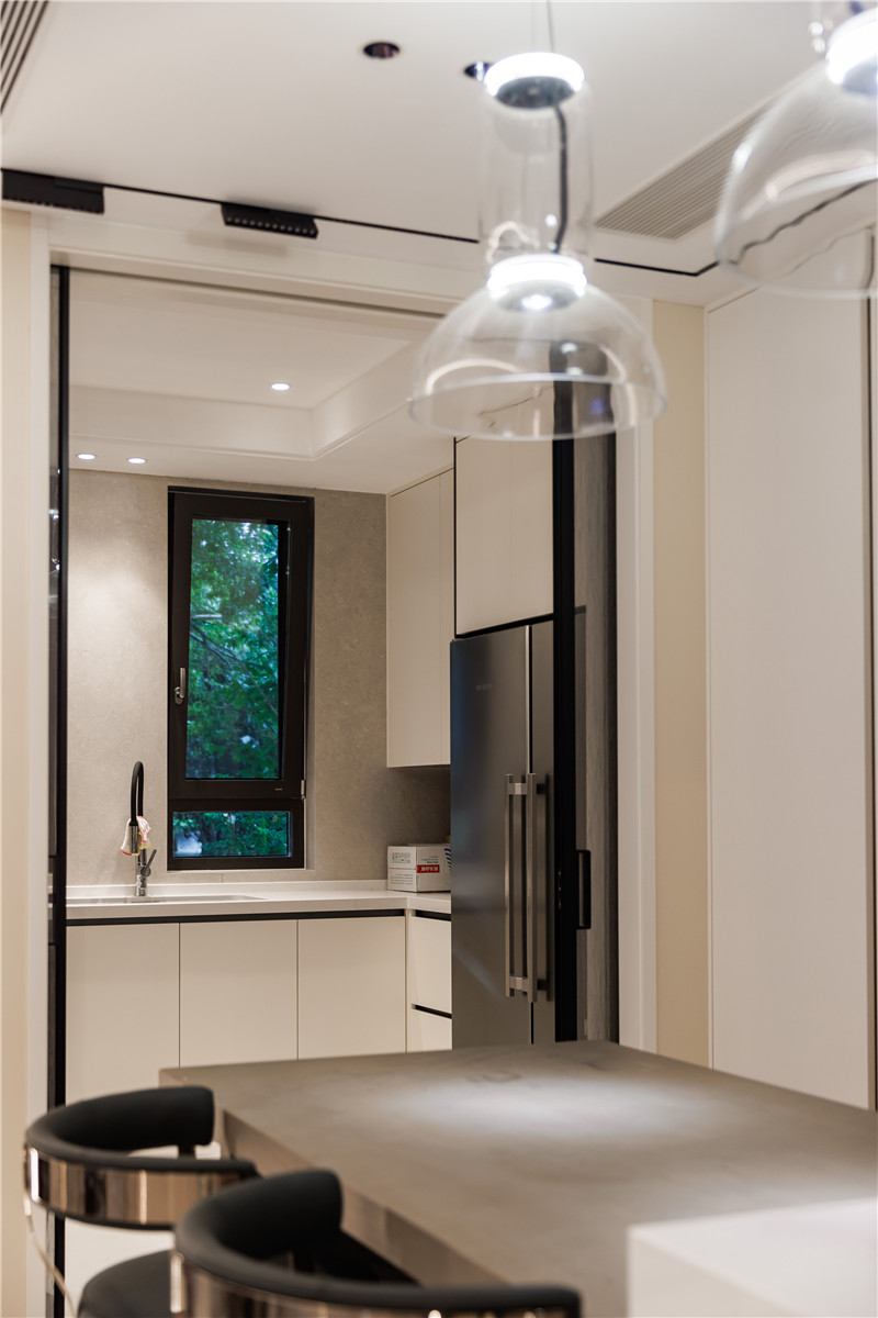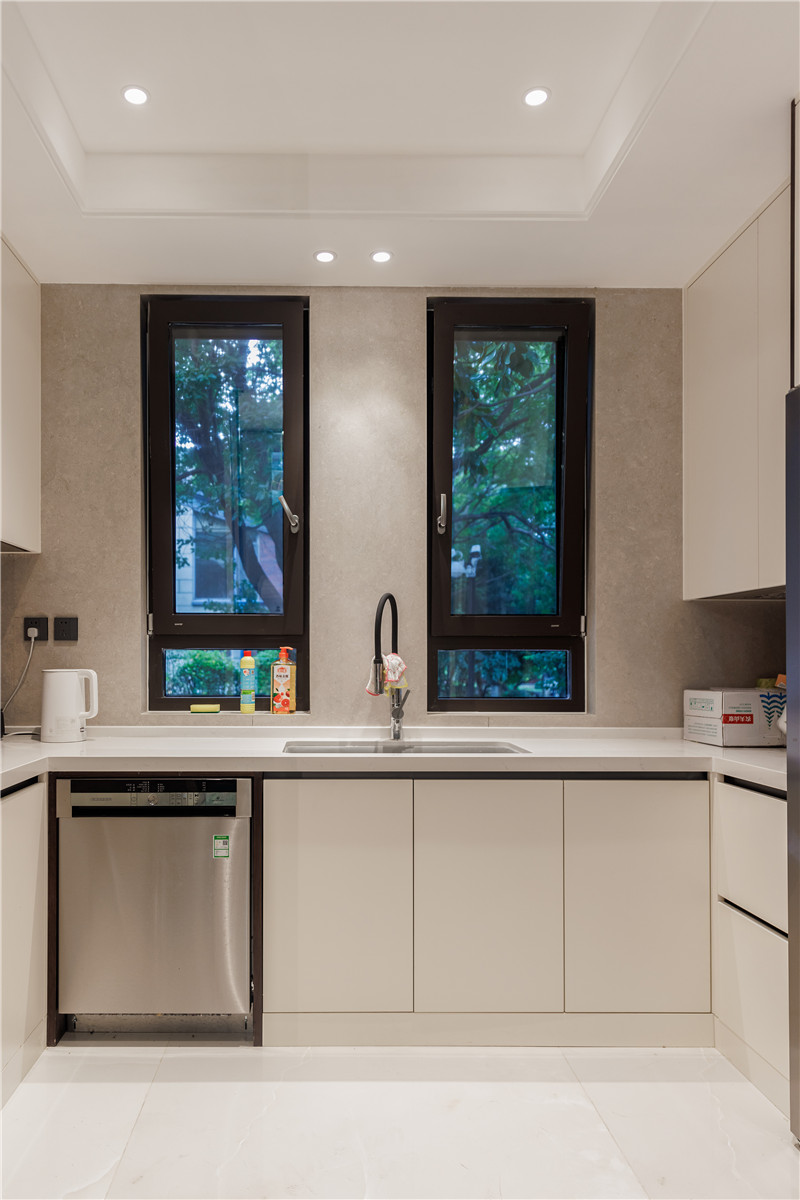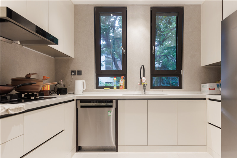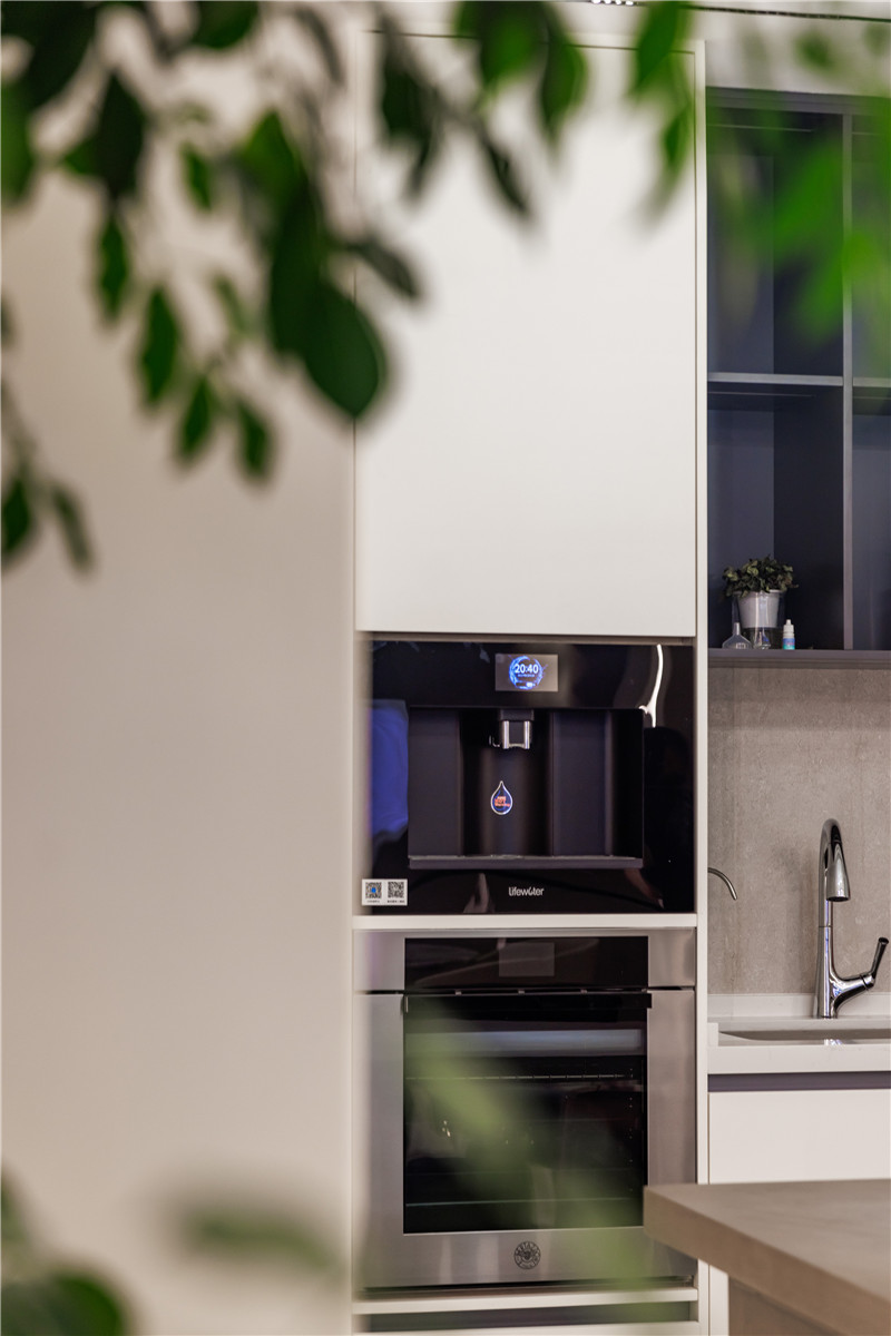 餐廚空間在整個一樓中占地面積很寬裕,所以除了U型櫥柜外,還在餐邊柜前做了含有島臺的西餐區(qū),望著窗外屋內(nèi)的綠意吃一頓早餐,應(yīng)該非常愜意吧~