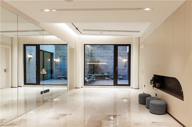 負(fù)一層的空間被劃分為多個功能性房間,客廳區(qū)域作為舞蹈教室或是瑜伽教室來使用,用整面到頂?shù)墓耋w做背景墻,中部不規(guī)則掏空讓空間更有呼吸感。