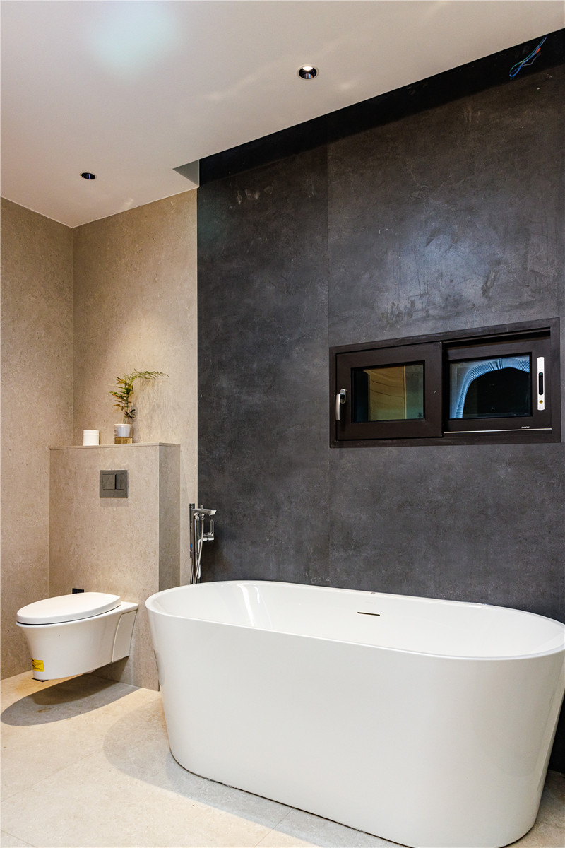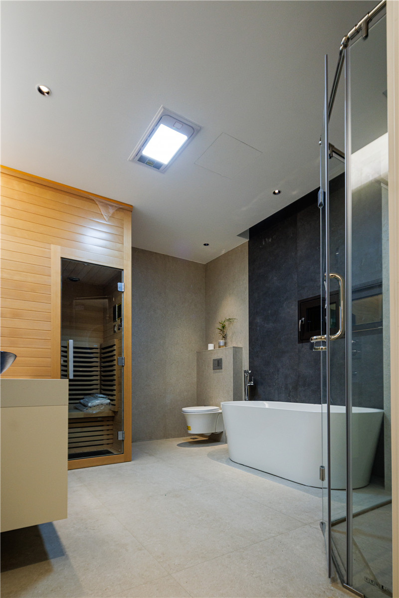 在客廳一側(cè)的小房間內(nèi)設(shè)計了一個包含汗蒸功能的衛(wèi)浴,沒有過多的設(shè)計,還原生活的本質(zhì),將實用與舒適奉為設(shè)計的核心。