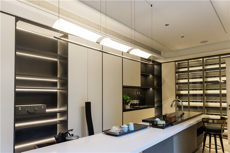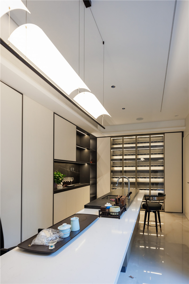 靠近庭院的里間做成了茶室和酒柜的結(jié)合區(qū)域,似船帆般的吊燈頗有雅奢氣質(zhì),酒柜在各種燈光的照射下頗顯不凡質(zhì)感。推杯換盞,觥籌交錯,在這空間里,品的是茶或是酒,賞的是樹或是葉,感悟的是人生。