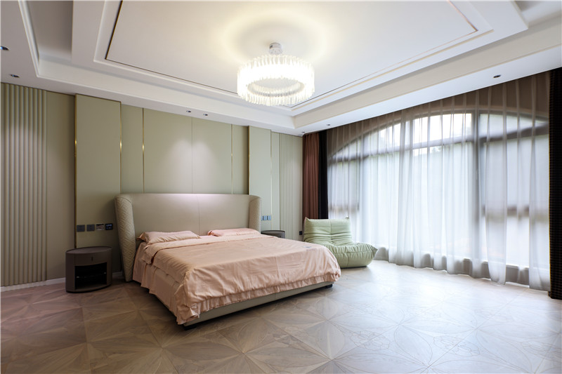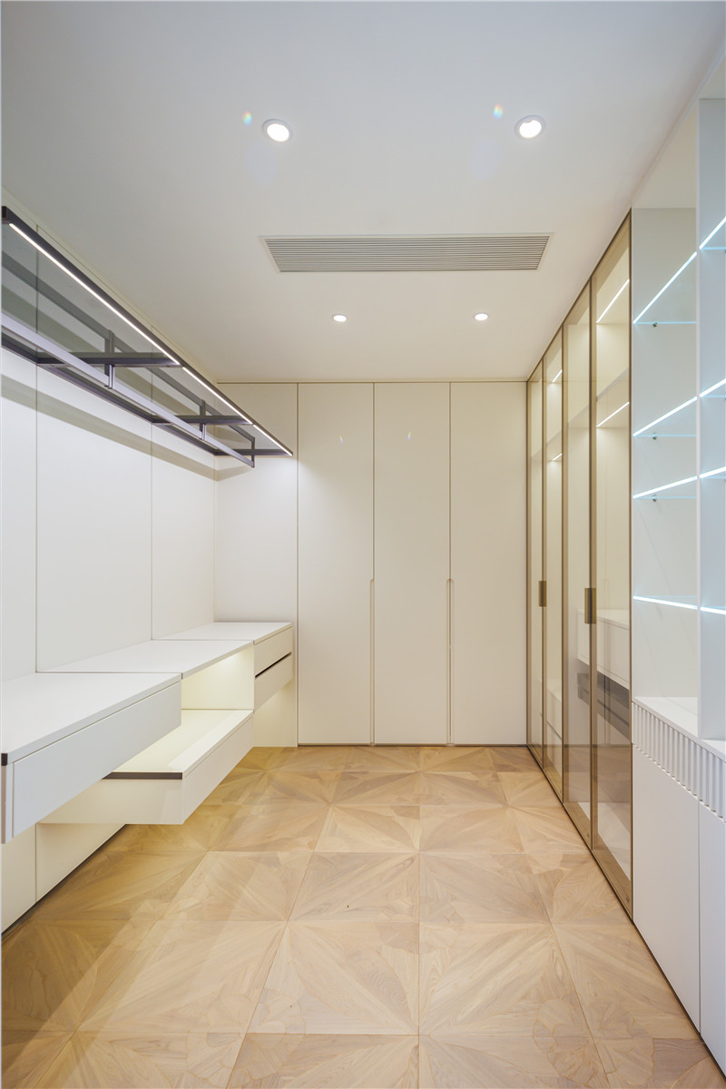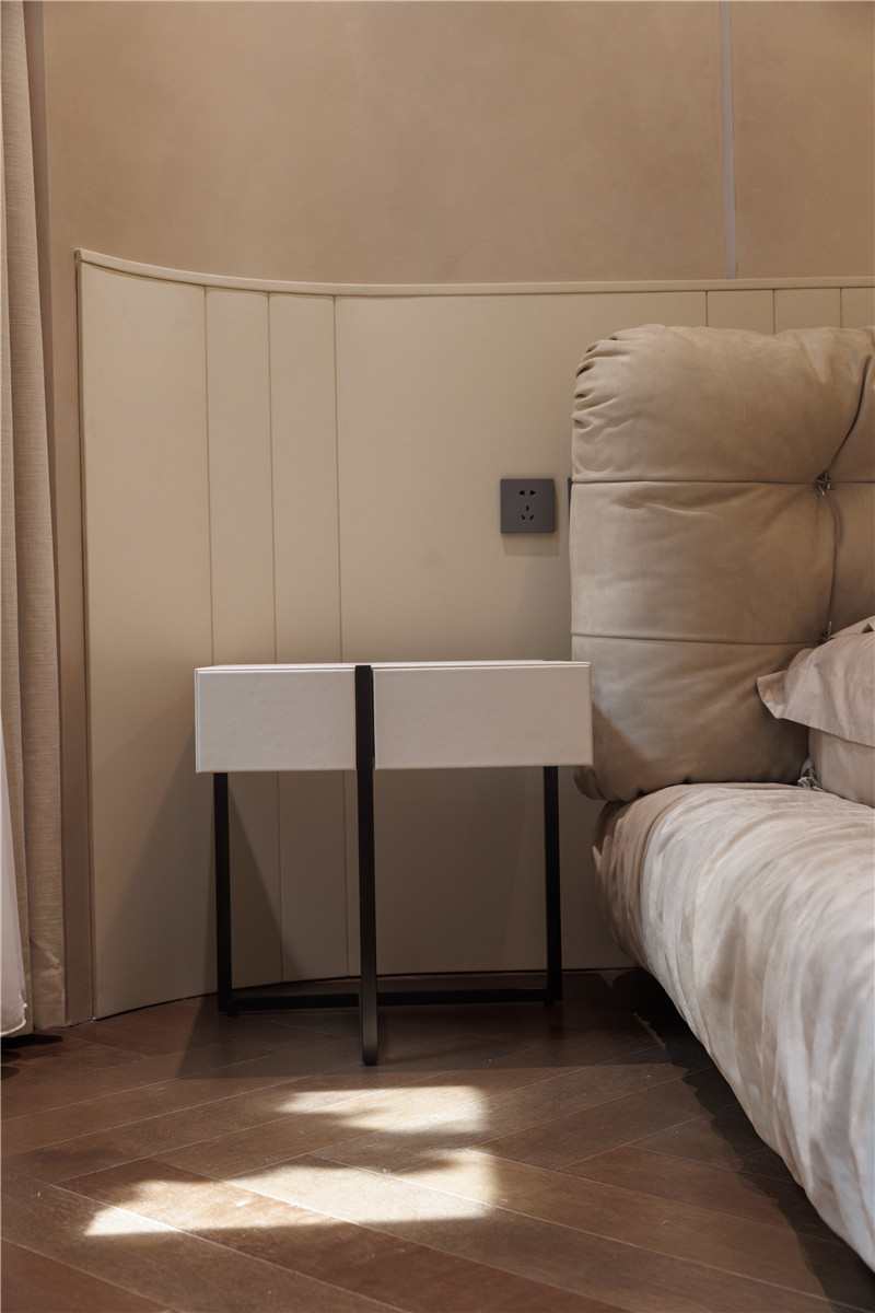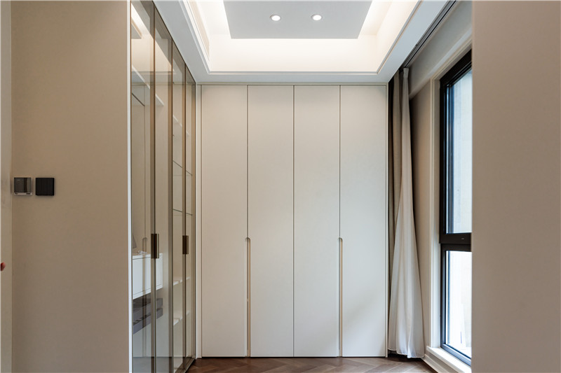 主臥的空間中背景墻采用了PU的皮革拼接護墻,半圓形的落地窗搭配白色窗幔十分優(yōu)雅。衣帽間一側(cè)采用了超白玻柜門的金屬衣柜,用于收納;另一側(cè)采用的是壁掛式的衣架方便展示,下方做懸掛式抽屜補充收納。