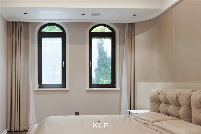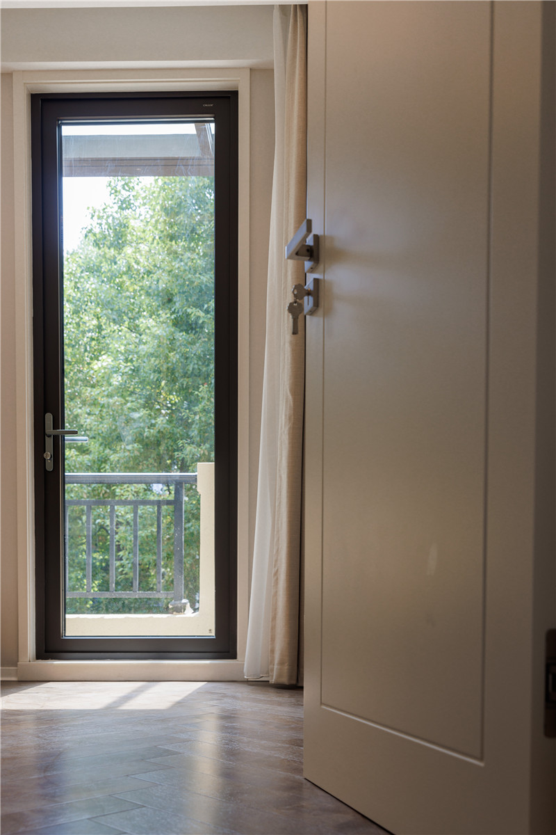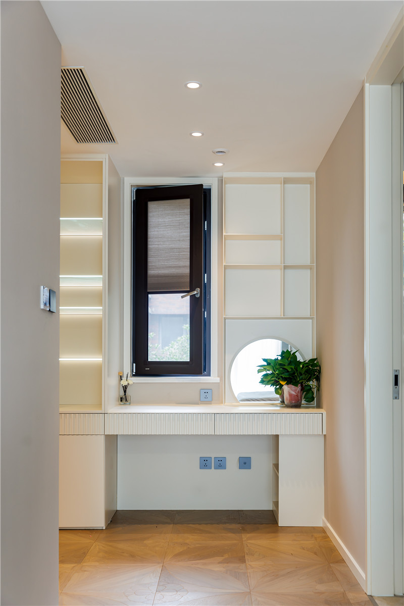 進入次臥空間內(nèi)便是次臥的衣帽間,到頂?shù)墓耖T采用一體化的銑型拉手,更顯簡潔干凈。次臥空間的自然光線來源于兩扇拱形窗戶,讓整個房間通透的同時增添了一份奶油風(fēng)的溫馨治愈。