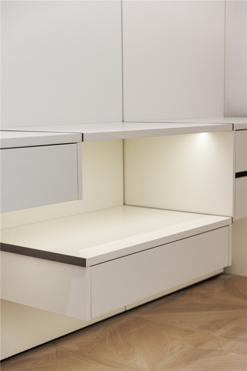 全屋衣柜櫥柜護墻都采用了客來福水漆產(chǎn)品,特調(diào)的白色系治愈純凈,整體設(shè)計和落地效果實現(xiàn)了居住價值,令人神往。