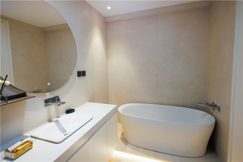 次臥空間的衛(wèi)浴在睡眠區(qū)一側(cè),所以做的是封閉式格局,白色的衛(wèi)浴柜收納起了大部分的生活用品,壁龕也承擔(dān)起另一部分的儲物需求,淋浴區(qū)放了浴缸,提升生活質(zhì)量。