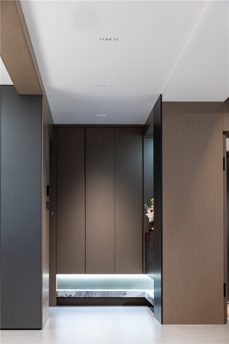 入門玄關(guān)整體L型構(gòu)造,其懸浮掏空設(shè)計,顯大且具深度;玄關(guān)造型采用內(nèi)退手法,借用臥室空間來做DIY放置區(qū);將條帶燈光嵌入內(nèi)退區(qū)拐角,明亮通透。