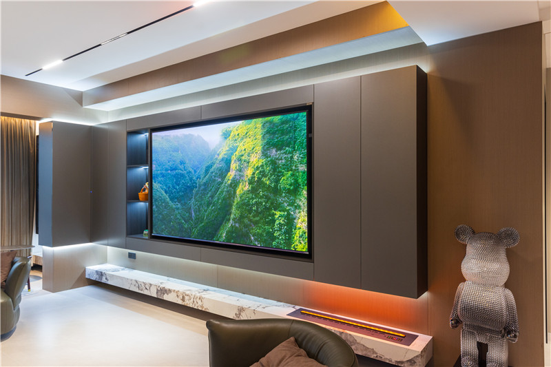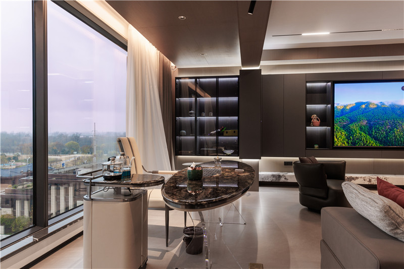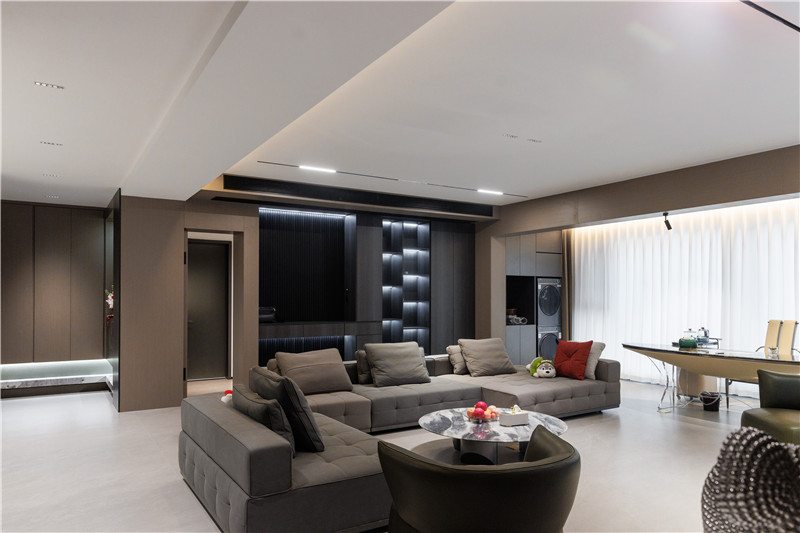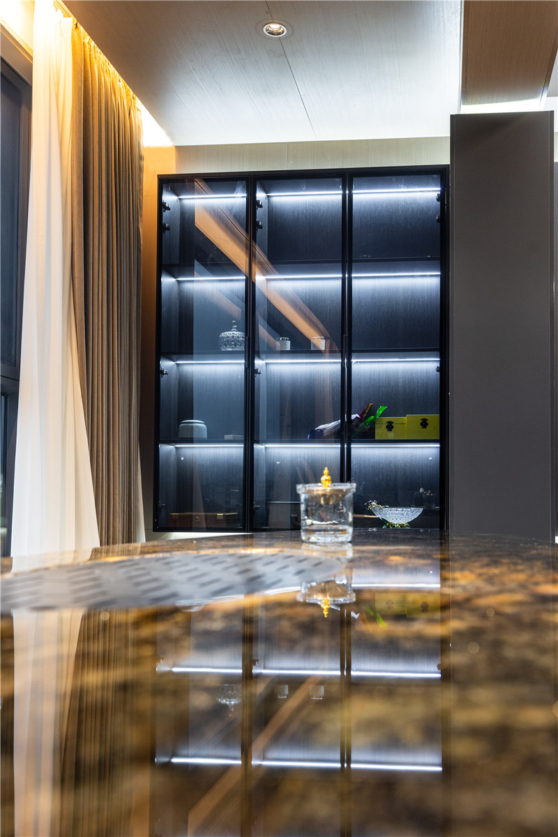 整屋科技直紋、睿智灰、黑木紋、茶白色拼接協(xié)調(diào),突顯全屋定制的魅力。