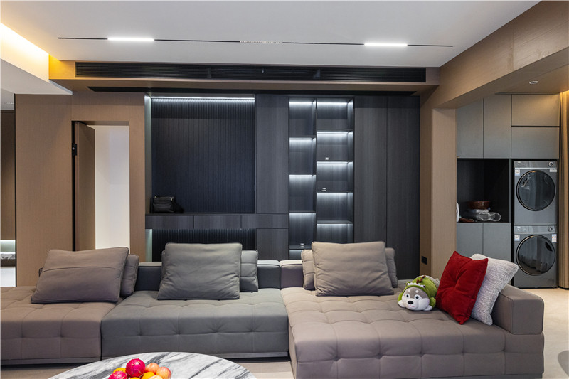 沙發(fā)背景墻為家里的動線區(qū),立柜+穿插設(shè)計貼墻而立,好看且頗顯趣味。