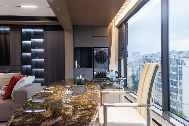 陽臺整體加入獨立式茶臺,圓弧造型盡顯高級感,沐浴陽光、品茶靜思,真是一件美事。一側(cè)小型洗衣房構(gòu)造,分散家里的洗漱壓力。