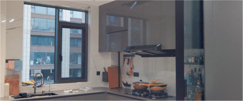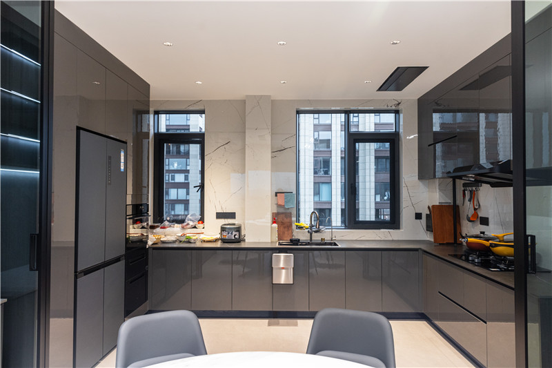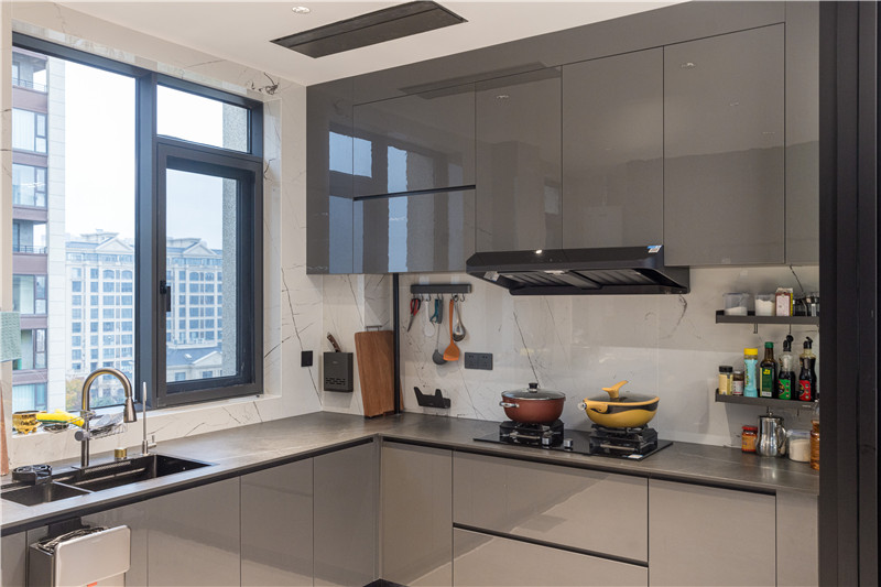 廚房U型構(gòu)造,根據(jù)墻體布局而建,洗切烹盛的動線提升便捷度。