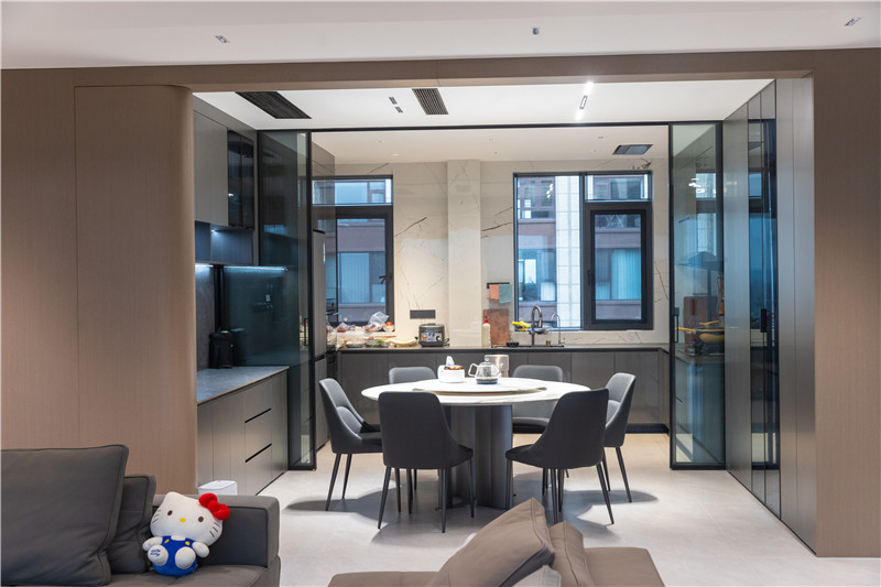 餐廚半開放式構(gòu)造,以推拉門做隔斷,兼顧美學(xué)與實用性。