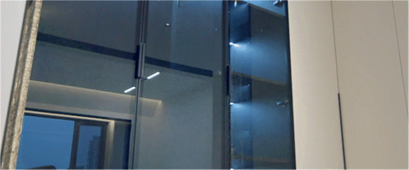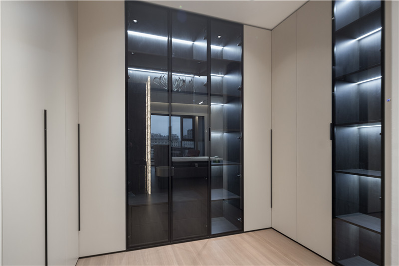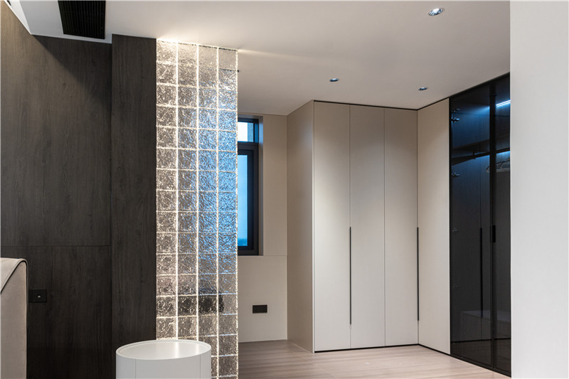 室內(nèi)以夢幻玻璃磚隔出一個衣帽間,梳妝臺依屋主需求定制高度,側(cè)邊U型立柜作為收納區(qū),展示區(qū)與私密區(qū)區(qū)分,符合人體工程學(xué)設(shè)計。