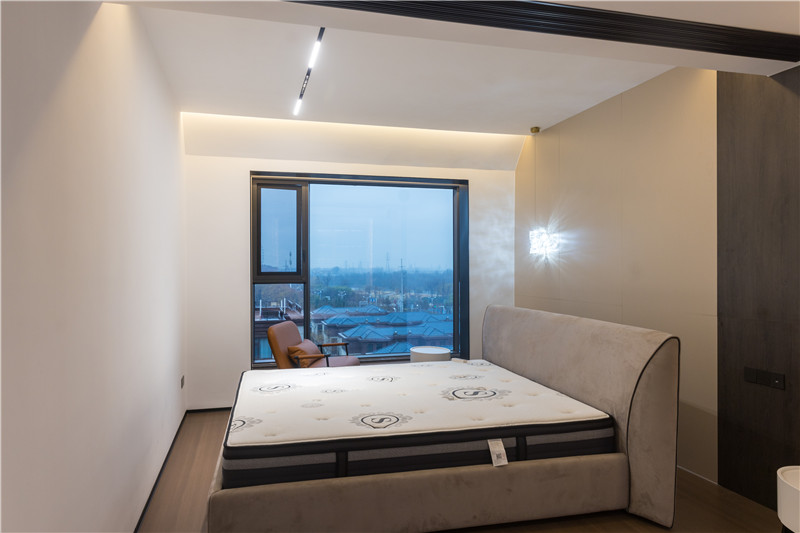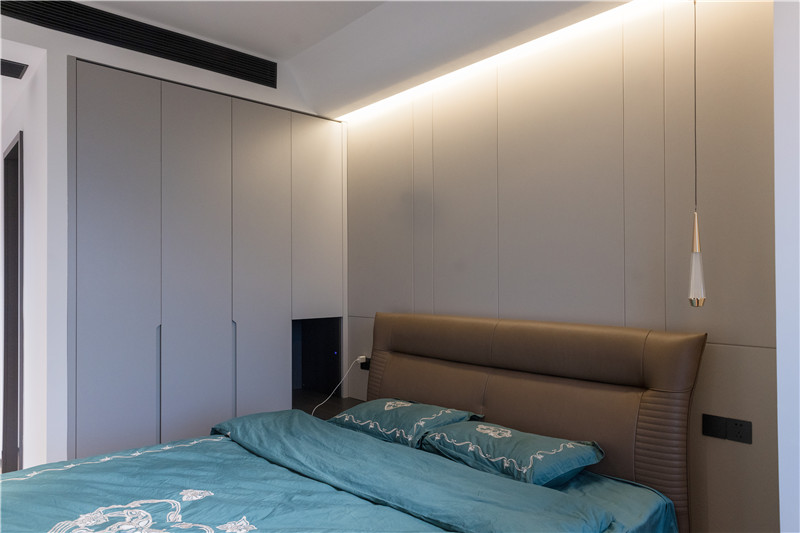 壁柜有效保障收納力、門板采用銑槽長拉手、柜體延伸為床頭柜,簡約實用;吊頂滿滿小心思,增強(qiáng)空間的光影感。