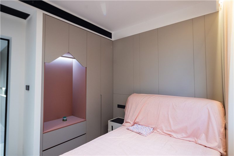 女兒房背景墻與衣柜一體化設(shè)計,中部做房屋造型并以粉色點綴,顯活潑靈動,這樣的溫馨小屋太讓人心動了吧~