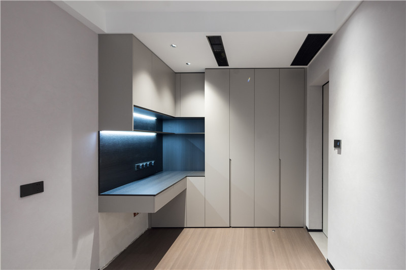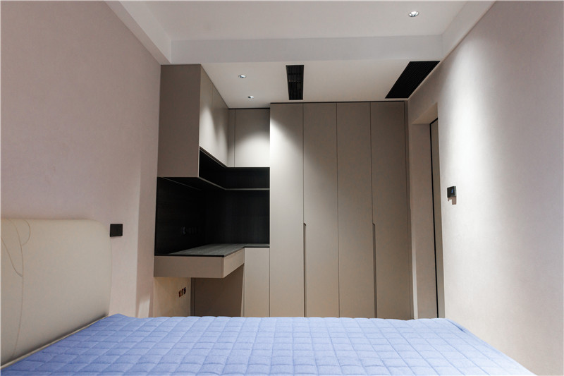 客臥兼書房使用,衣柜延伸為書桌,以懸挑設(shè)計突出特色。墻面采用了藝術(shù)漆,易擦拭,方便屋主整理清潔。