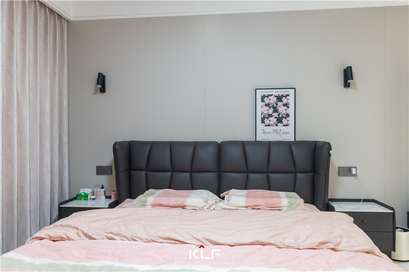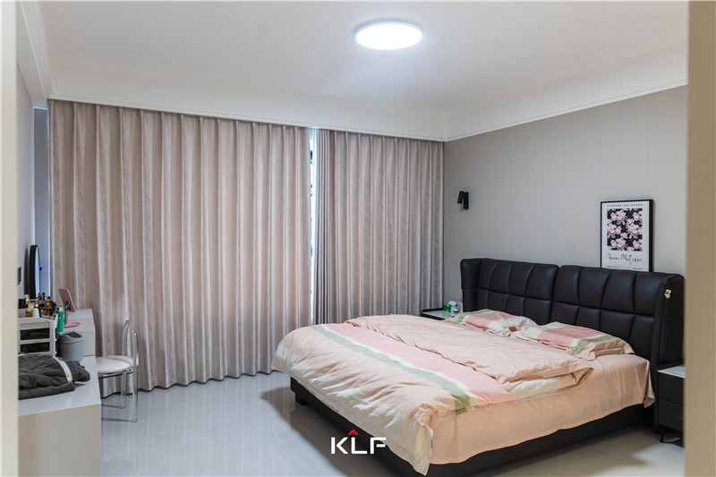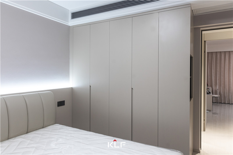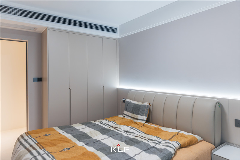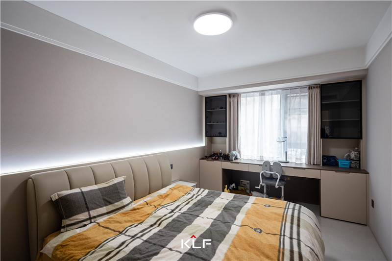 主臥以茶白調(diào)盡顯柔和溫潤(rùn)。入門(mén)到頂式立柜協(xié)調(diào)拼接式床頭板、銑槽長(zhǎng)拉手不占空間,靠窗建立小型書(shū)柜,靈活性強(qiáng)。