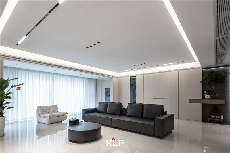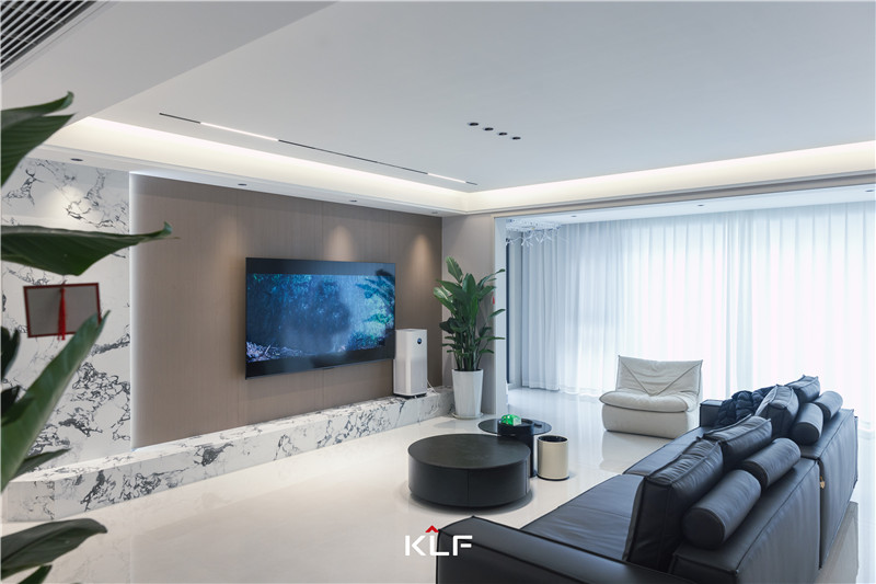 客廳、陽(yáng)臺(tái)打通,橫廳構(gòu)造讓整體空間通透清新。