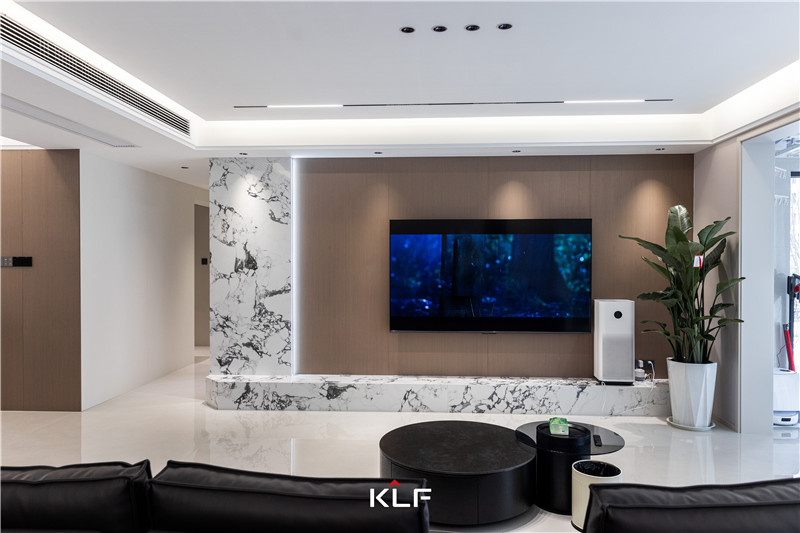 木質(zhì)電視背景墻邊圍以大理石紋磚做突出,沙發(fā)背景墻整面立柜設(shè)計(jì),玻璃柜、木質(zhì)柜做拼接,以穿插設(shè)計(jì)、拉手造型做個(gè)性化,彰顯美感。