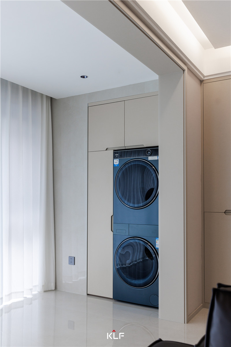 陽(yáng)臺(tái)洗烘一體式洗衣房,整體與沙發(fā)背景墻相協(xié)調(diào),分散家里的洗漱壓力。