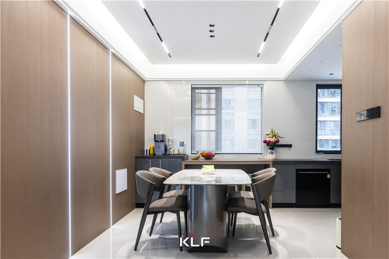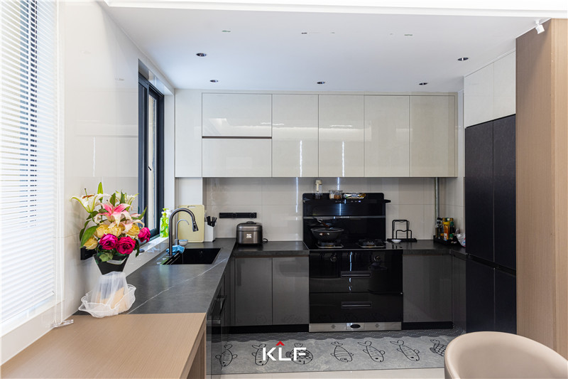進(jìn)門(mén)配套餐桌椅巖板圓弧收邊,耐污防滲水的同時(shí)安全系數(shù)高。櫥柜以U型構(gòu)造發(fā)揮收納存儲(chǔ)功能,上淺下深構(gòu)造、門(mén)板為亮面,易清潔打理。