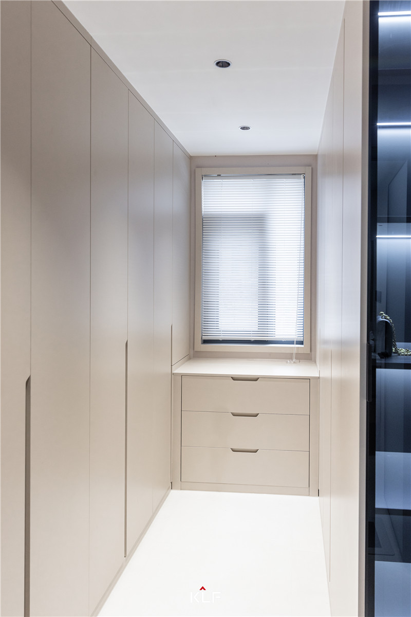 家里的狹長(zhǎng)區(qū)域不知道怎么利用?不妨做成獨(dú)立式小型衣帽間。衣柜呈U型構(gòu)造,抽屜與立柜相組合,是家里的多功能房,分散存儲(chǔ)收納壓力。