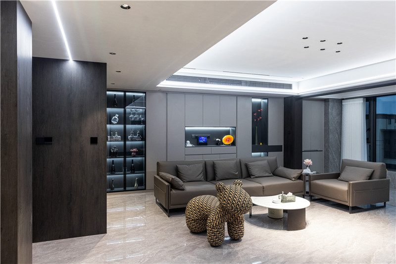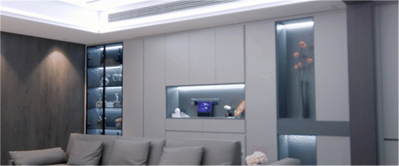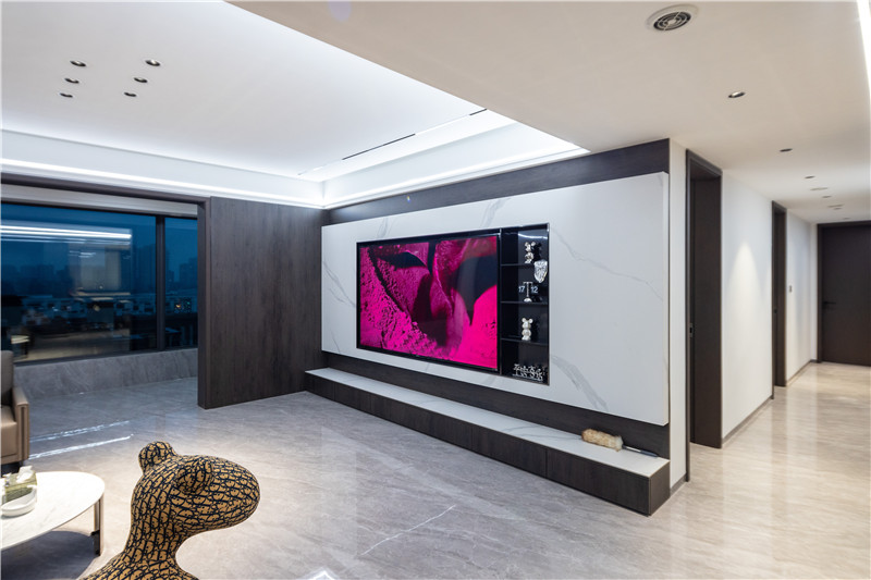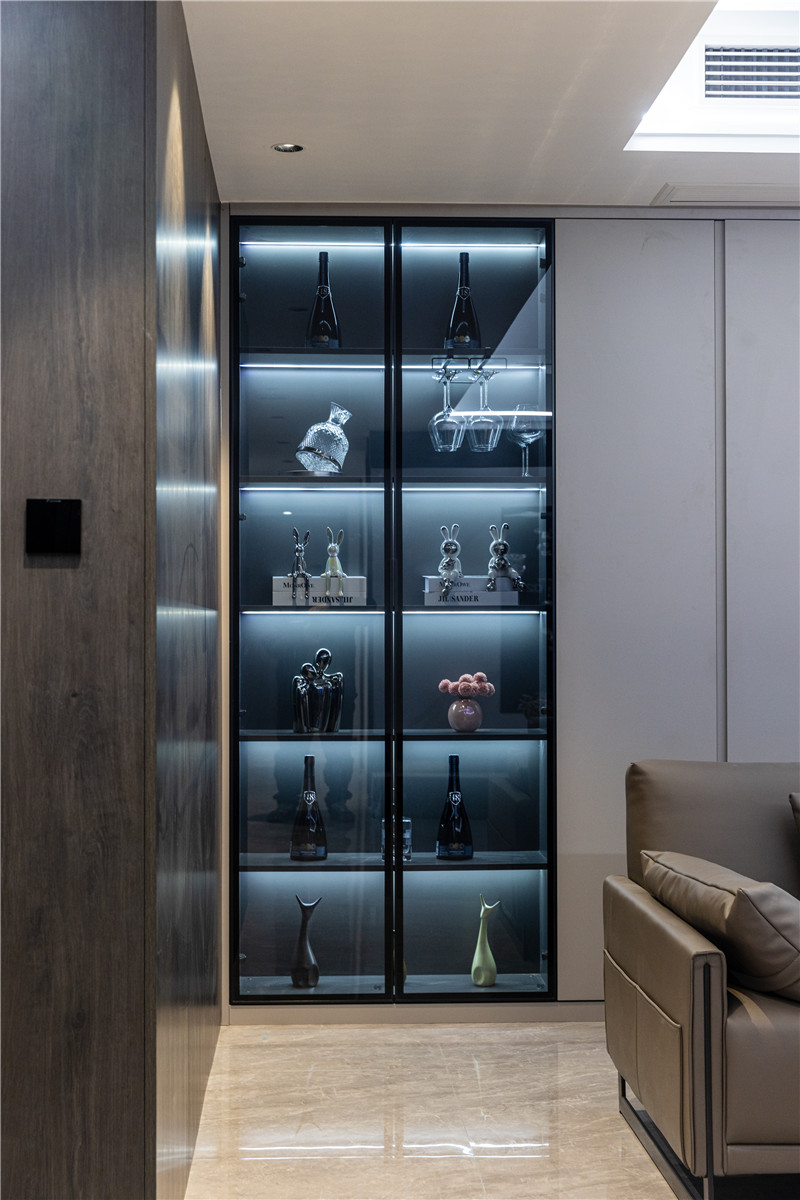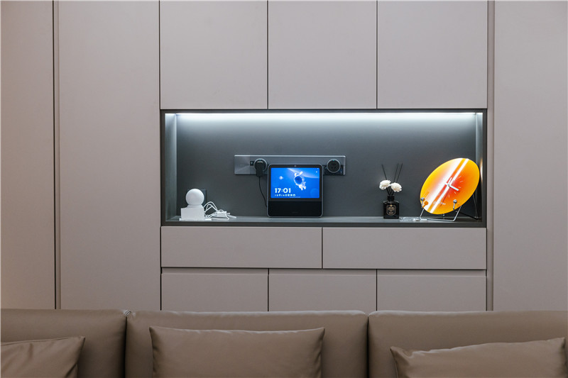 一側(cè)玻璃展示柜,是手辦區(qū)亦是藏酒區(qū);一側(cè)穿插設(shè)計嵌入燈光,是家里的氛圍區(qū);中部整面立柜,在合適高度掏空并預(yù)留軌道插座,實用性強(qiáng)。