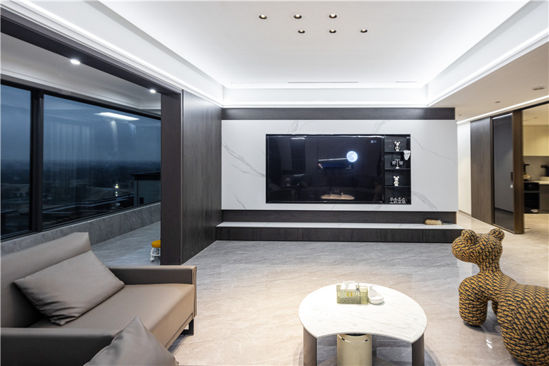 電視背景墻采用整面大理石紋背板,將電視機(jī)嵌入?yún)f(xié)調(diào)統(tǒng)一布局,側(cè)邊深調(diào)開放格放置裝飾擺件,突顯個性化;一字型電視底柜為無拉手設(shè)計,是小物件及常用物品的存放地。