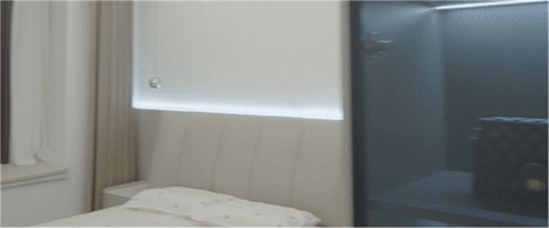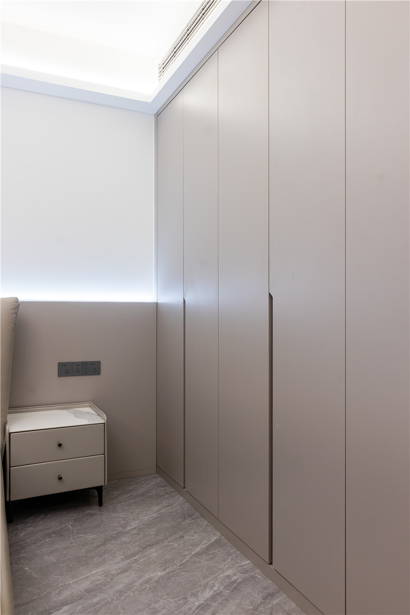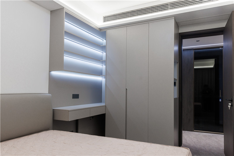 梳妝臺與床頭柜結(jié)合,上方做開放區(qū)并嵌入條帶燈,有效解決視覺死角問題;抽屜做無拉手,避免梳妝時的遮擋;側(cè)邊衣柜到頂設(shè)計,邊角做薄側(cè)柜,存儲在線。
