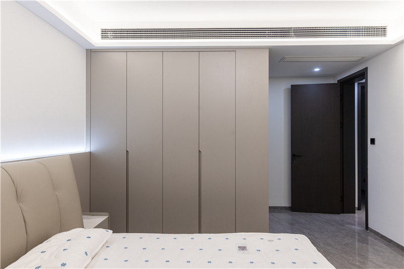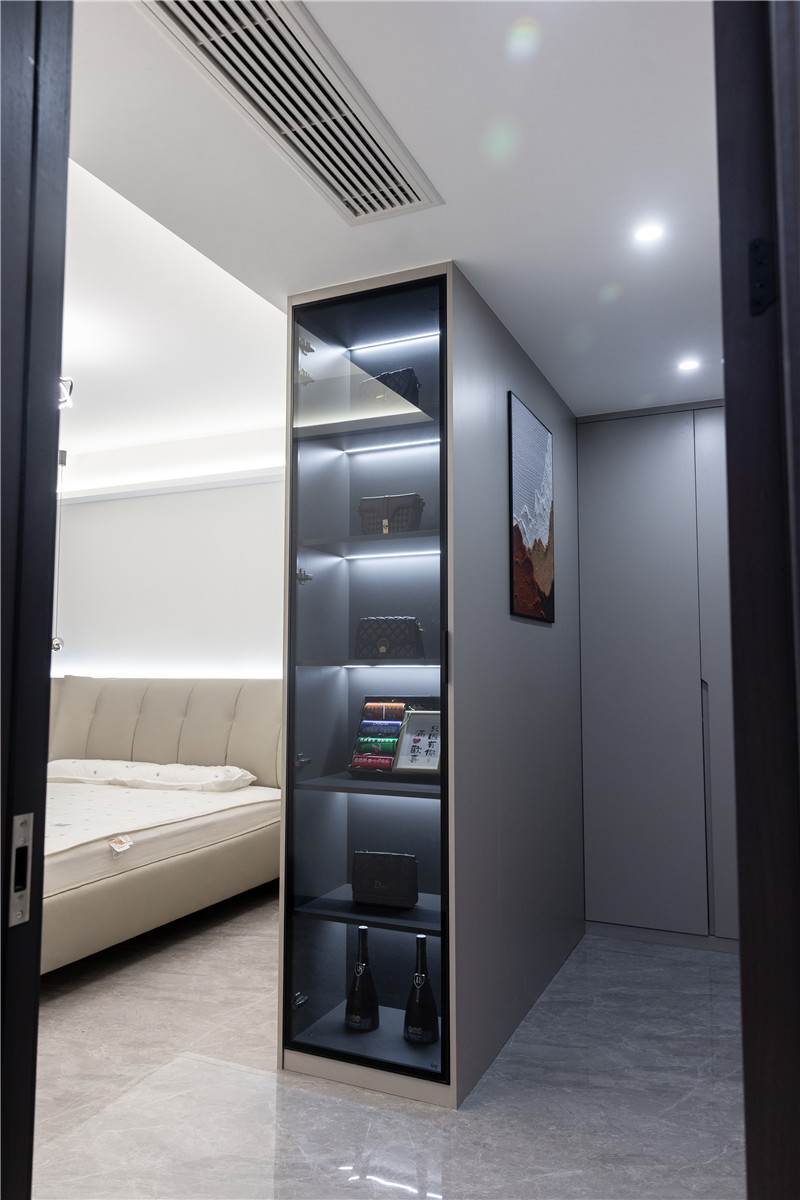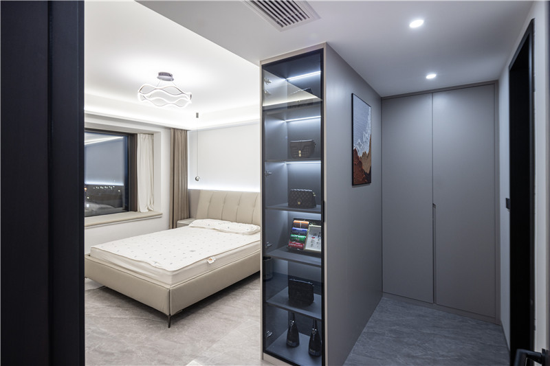 一組衣柜作為隔斷分離出小型衣帽間,一柜雙用突顯設(shè)計智慧;隔斷柜窄側(cè)玻璃柜展示,與眾不用;內(nèi)側(cè)立柜雙開,可根據(jù)屋主需求進(jìn)行合理分區(qū),為便捷高效的找尋助力。